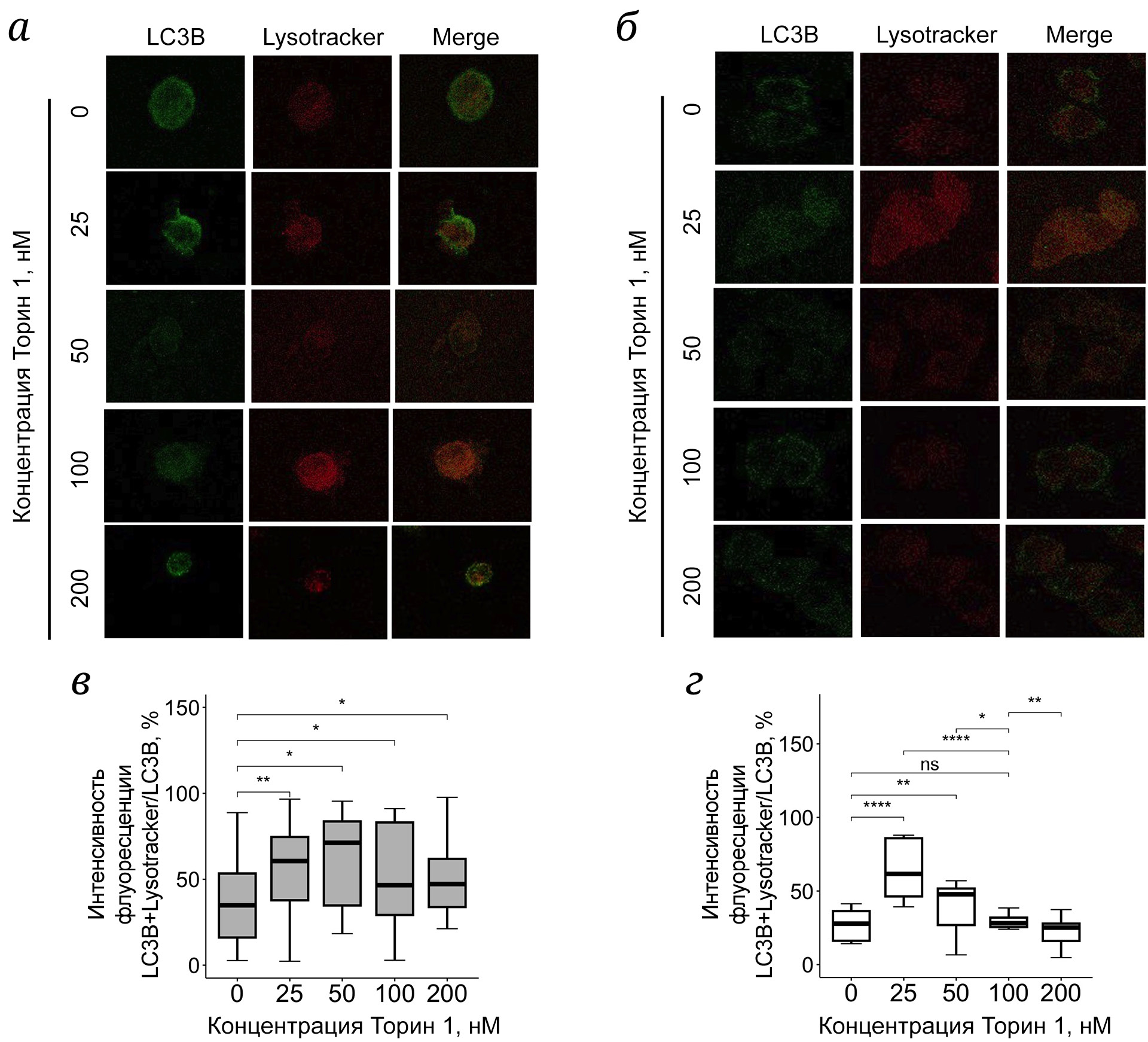 Рис. 3. Оценка степени колокализации LC3B с лизосомами при дозозависимом ингибировании протеинкиназы mTOR Торином 1. а – Данные иммунофлуоресценции для белка LC3B и лизосом в первичной культуре макрофагов периферической крови, 10 мкм; б – данные иммунофлуоресценции для белка LC3B и лизосом в клеточной линии нейробластомы SH-SY5Y, 10 мкм. в – Степень колокализации LC3B с лизосомами в первичной культуре макрофагов периферической крови (n = 6, где n – число независимых образцов); г – степень колокализации LC3B с лизосомами клеточной линии нейробластомы SH-SY5Y (n = 5, где n – число независимых клеточных линий). * p < 0,05; ** p < 0,01; **** p < 0,0001; ns – без статистической значимости