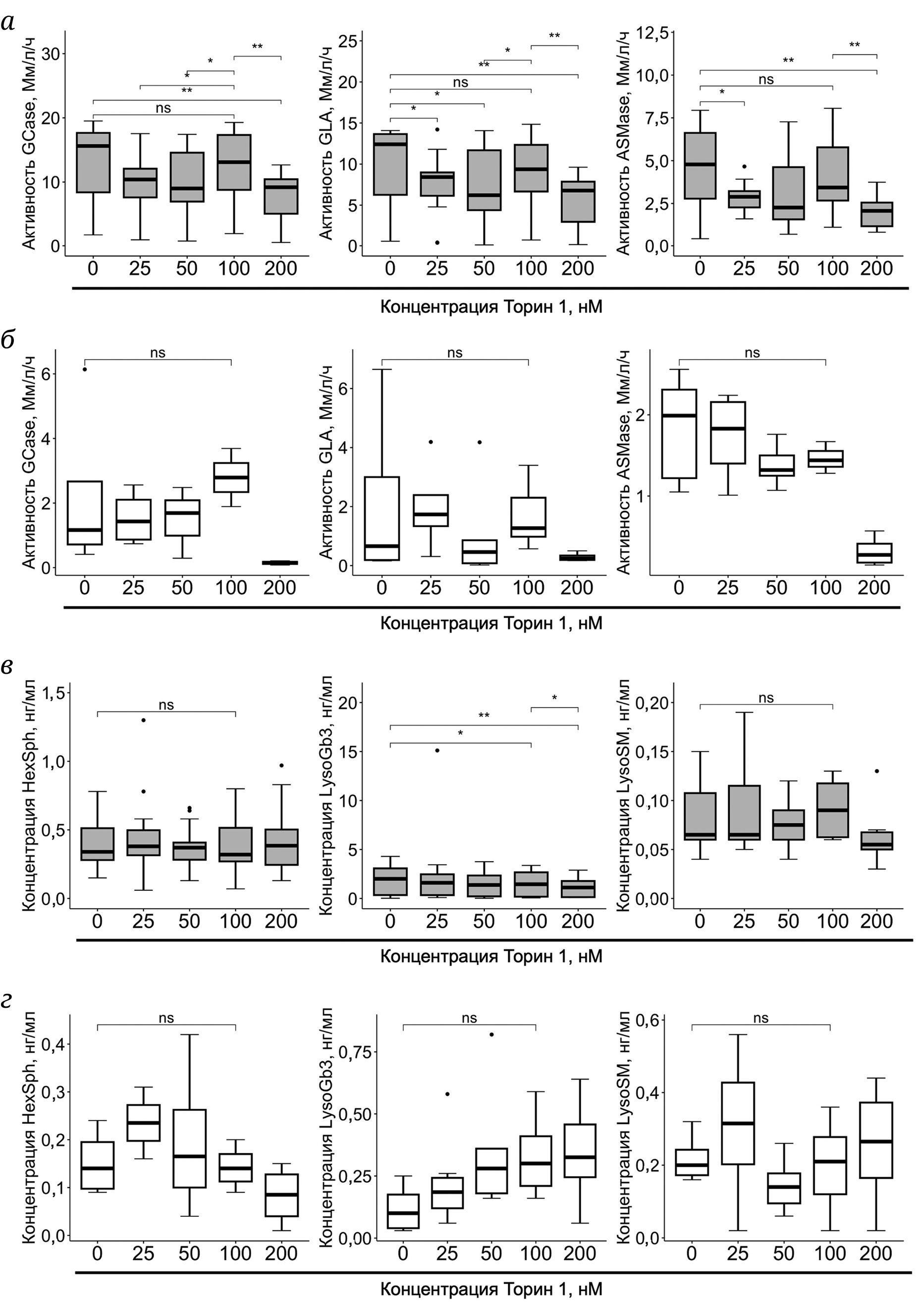 Рис. 4. Активность лизосомных ферментов (GCase, GLA, ASMase) и концентрации соответствующих лизосфинголипидов (HexSph, LysoGb3, LysoSM) при дозозависимом ингибировании протеинкиназы mTOR Торином 1 в первичной культуре макрофагов периферической крови (а и в; n = 6, где n – число независимых образцов) и клеточной линии нейробластомы SH-SY5Y (б и г; n = 5, где n – число независимых клеточных линий). * p < 0,05; ** p < 0,01; ns – без статистической значимости