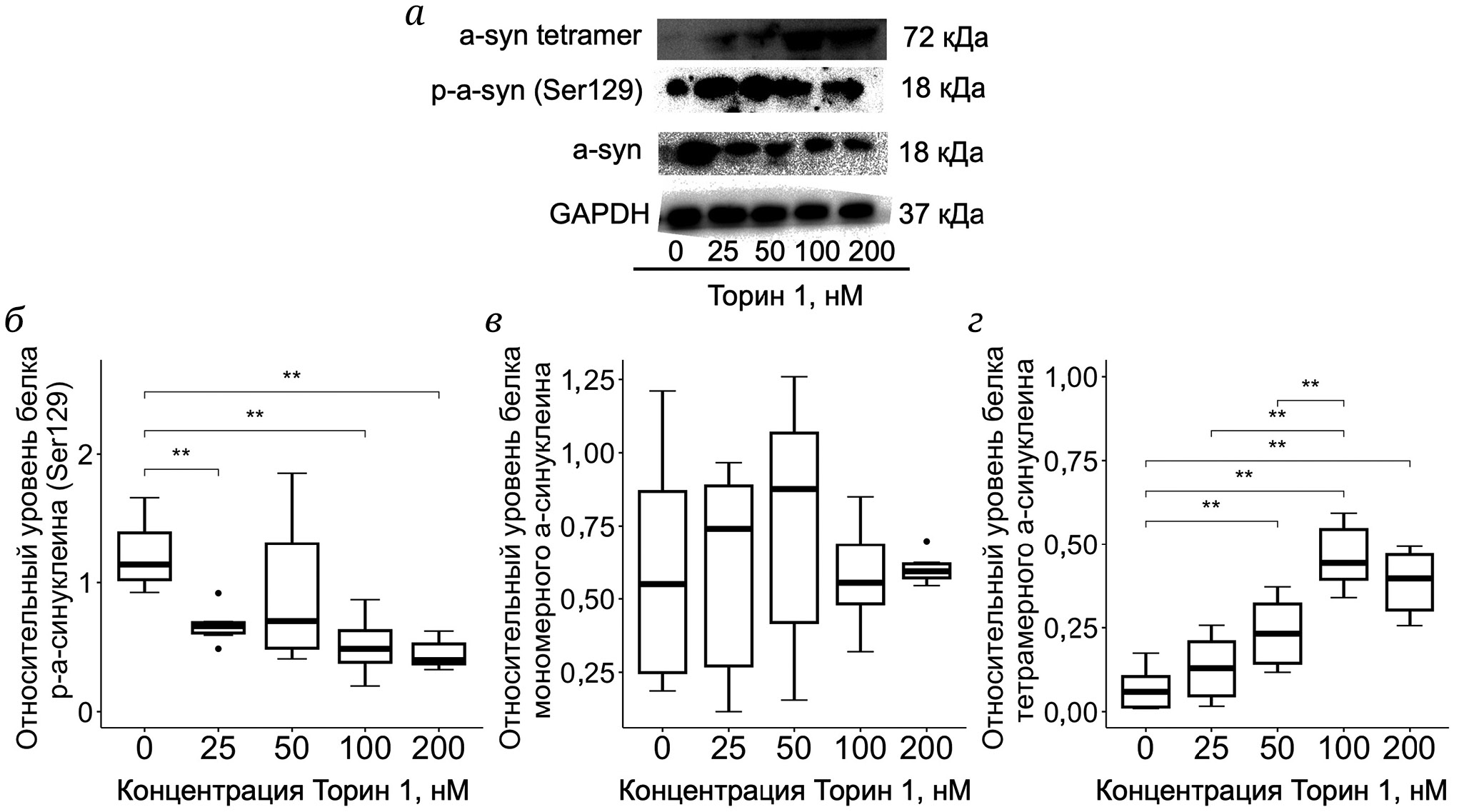 Рис. 5. Влияние дозозависимого ингибирования протеинкиназы mTOR Торином 1 на уровень различных форм белка альфа-синуклеина (мономерный, фосфорилированный (Ser129), тетрамерный) в клеточной линии нейробластомы SH-SY5Y (n = 5, где n – число независимых клеточных линий). а –Данные вестерн-блота для различных форм белка альфа-синуклеина (мономерный, фосфорилированный (Ser129), тетрамерный). б – Относительный уровень фосфорилированной (Ser129) формы белка альфа-синуклеина; в – относительный уровень мономерной формы белка альфа-синуклеина; г – относительный уровень тетрамерной формы белка альфа-синуклеина; ** p < 0,01