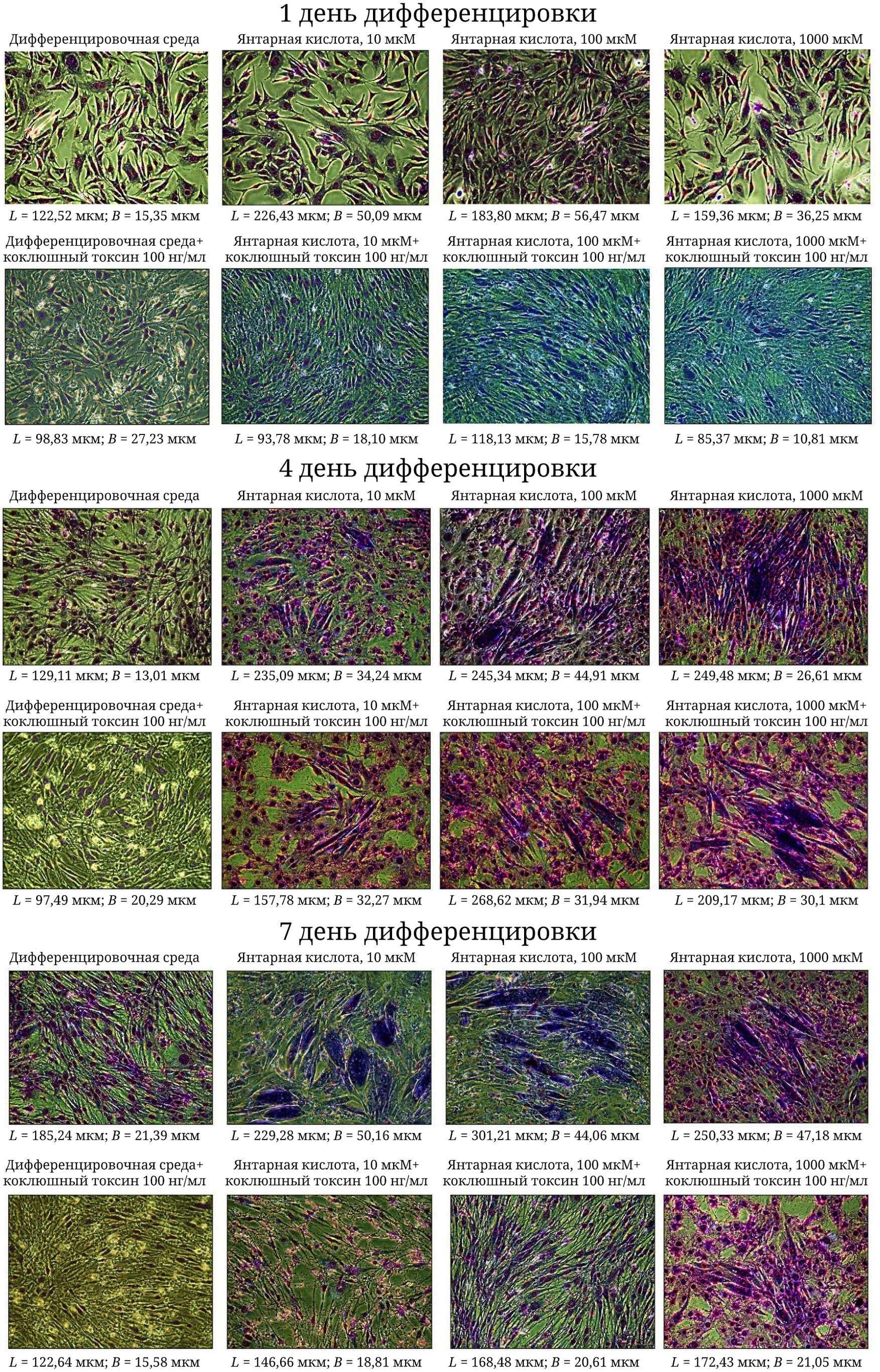 Рис. 1. Клетки С2С12 до дифференцировки и на разных стадиях дифференцировки. Фазово-контрастная микроскопия; 200×. Окрашивание ядер по Романовскому–Гимзе; L – длина миобластов; B – ширина миобластов