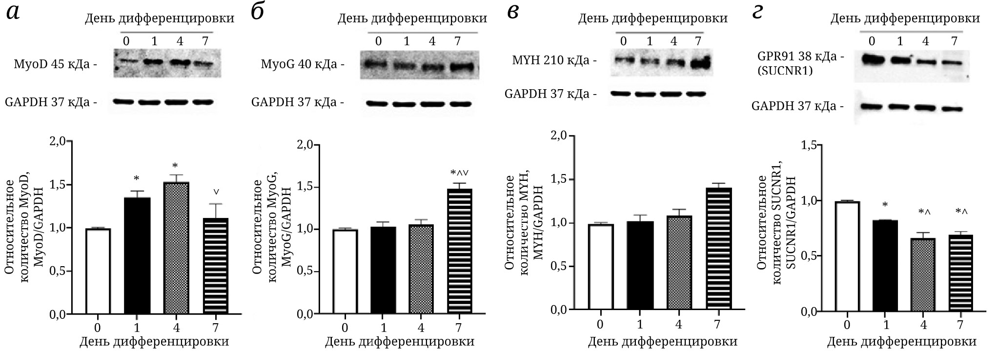 Рис. 2. Результаты вестерн-блот-анализа относительного количества MyoD (а), MyoG (б), MYH (в), SUCNR1 (г) в зависимости от дня дифференцировки клеток С2С12. * р < 0,05 – по сравнению с контролем (до дифференцировки); ^ р < 0,05 – по сравнению с первым днем дифференцировки; ˅ р < 0,05 – по сравнению с четвертым днем дифференцировки