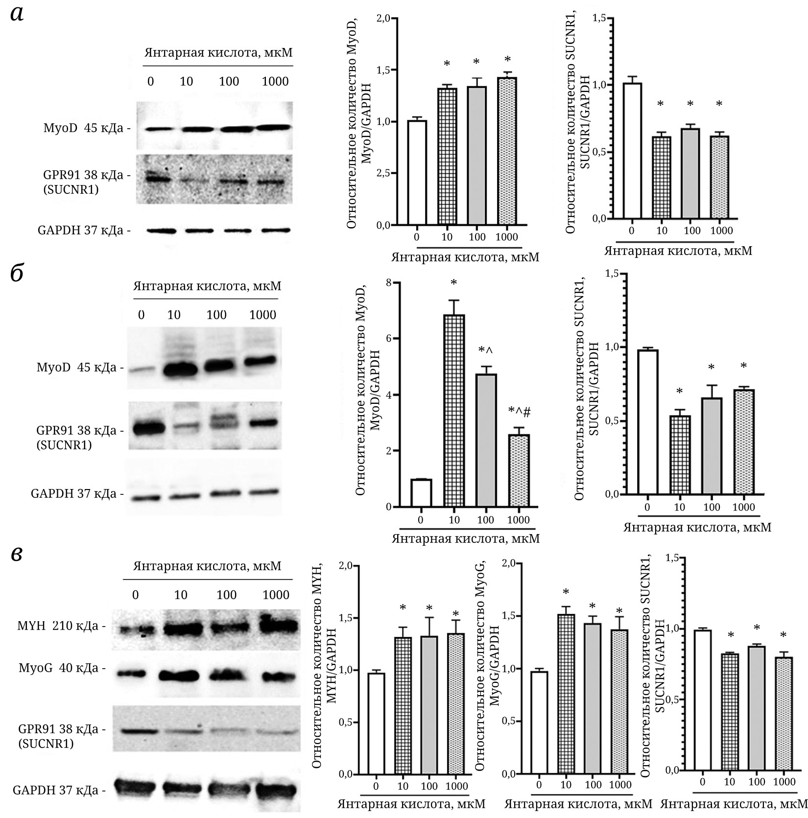 Рис. 3. Результаты вестерн-блот-анализа относительного количества MyoD и SUCNR1 на 1-й (а) и 4-й (б) дни дифференцировки; MYH, MyoG, SUCNR1 – на 7-й день дифференцировки (в) при воздействии янтарной кислоты в концентрациях 10, 100, 1000 мкМ на клетки С2С12. *р < 0,05 – по сравнению со значениями соответствующего дня дифференцировки без добавления янтарной кислоты