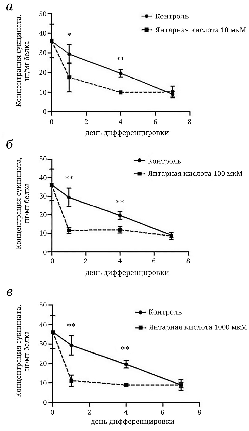 Рис. 4. Концентрация сукцината в клетках С2С12 в процессе их миогенной дифференцировки при внесении в питательную среду янтарной кислоты в концентрациях 10 (а), 100 (б) и 1000 (в) мкМ (метод детекции – ВЭЖХ-МС/МС). * р < 0,05; ** p < 0,01 – статистически значимые различия между группами