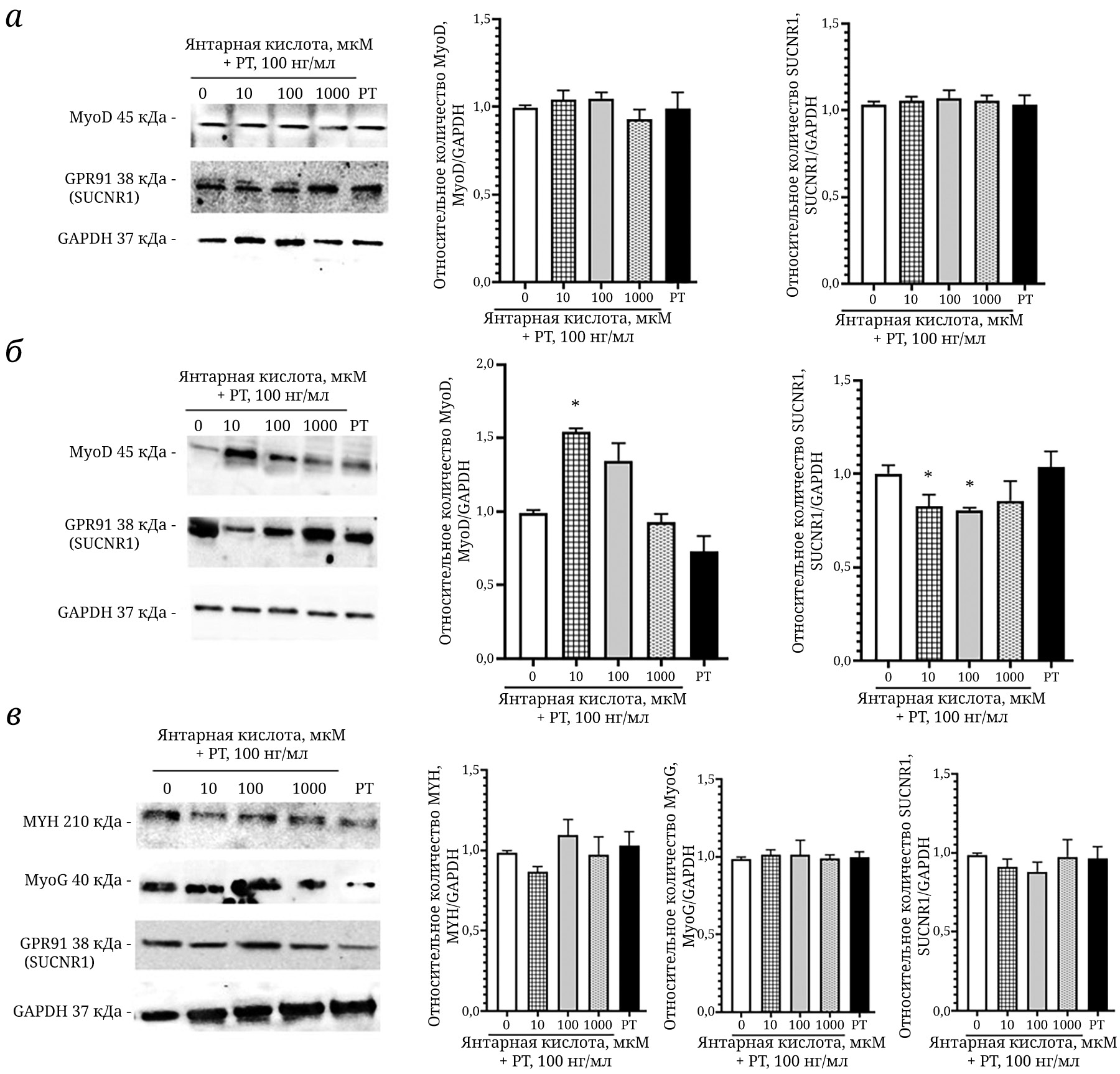 Рис. 5. Результаты вестерн-блот-анализа относительного количества MyoD и SUCNR1 на 1-й (а) и 4-й (б) дни дифференцировки; MYH, MyoG, SUCNR1 – на 7-й день дифференцировки (в) при воздействии янтарной кислоты в концентрациях 10, 100, 1000 мкМ, коклюшного токсина (Pertussis toxin (РТ), 100 нг/мл) и их сочетанного применения на клетки С2С12. * р < 0,05 – по сравнению со значениями соответствующего дня дифференцировки без добавления янтарной кислоты