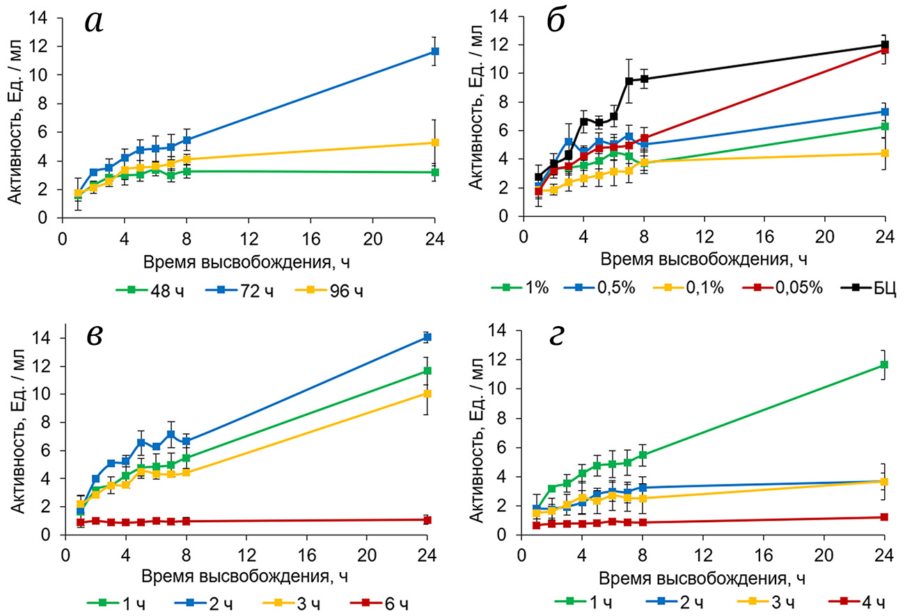 Рис. 2. Влияние условий создания композита БЦ–хитозан на высвобождение фермента в течение 24 ч. а – Влияние времени выращивания плёнок; б – влияние концентрации хитозана. Активность фермента, иммобилизованного на плёнки БЦ, показана для сравнения на панели. в – Влияние времени инкубации с хитозаном; г – влияние времени инкубации с глутаровым альдегидом