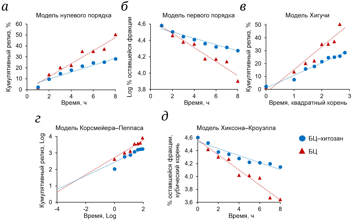 Рис. 3. Графическое изображение кинетических моделей высвобождения для L-АСП, иммобилизованной на БЦ–хитозан или БЦ. а – Модель нулевого порядка. б – Модель первого порядка. в – Модель Хигучи. г – Модель Корсмейера–Пеппаса. д – Модель Хиксона–Кроуэлла
