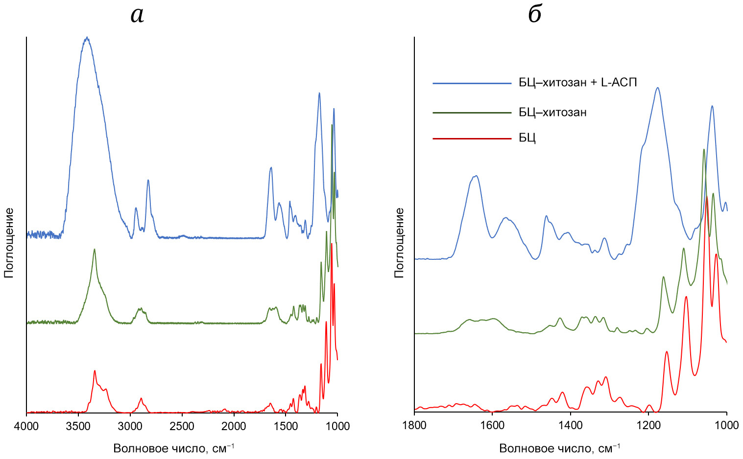 ИК-Спектры состава плёнок. Для идентификации химического состава плёнок БЦ–хитозан или БЦ с иммобилизованной L-АСП были получены их ИК-спектры (рис. 4).
