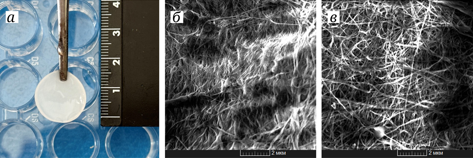 Морфология плёнок. Культивирование штамма продуцента K. hansenii в 24-луночном планшете позволяет получать биоплёнки 16 мм в диаметре (рис. 5, а). Анализ СЭМ проводили для определения морфологических изменений каркаса БЦ до и после модификации. В процессе лиофилизации в БЦ образуются пустоты, которые определяют финальную пористую структуру [71]. Микроструктуры БЦ и БЦ–хитозан показаны на рис. 5. У плёнок БЦ–хитозан (рис. 5, б) формируется более упорядоченная пористая послойная структура и большее количество пор меньшего диаметра по сравнению с БЦ (рис. 5, в). Нановолокна БЦ более плотно переплетены и свернуты по сравнению с более рыхло расположенными волокнами БЦ. Таким образом, различная степень плотности трёхмерной сети БЦ и БЦ–хитозан будет влиять на набухание, адсорбционную ёмкость плёнок и скорость высвобождения L-АСП.