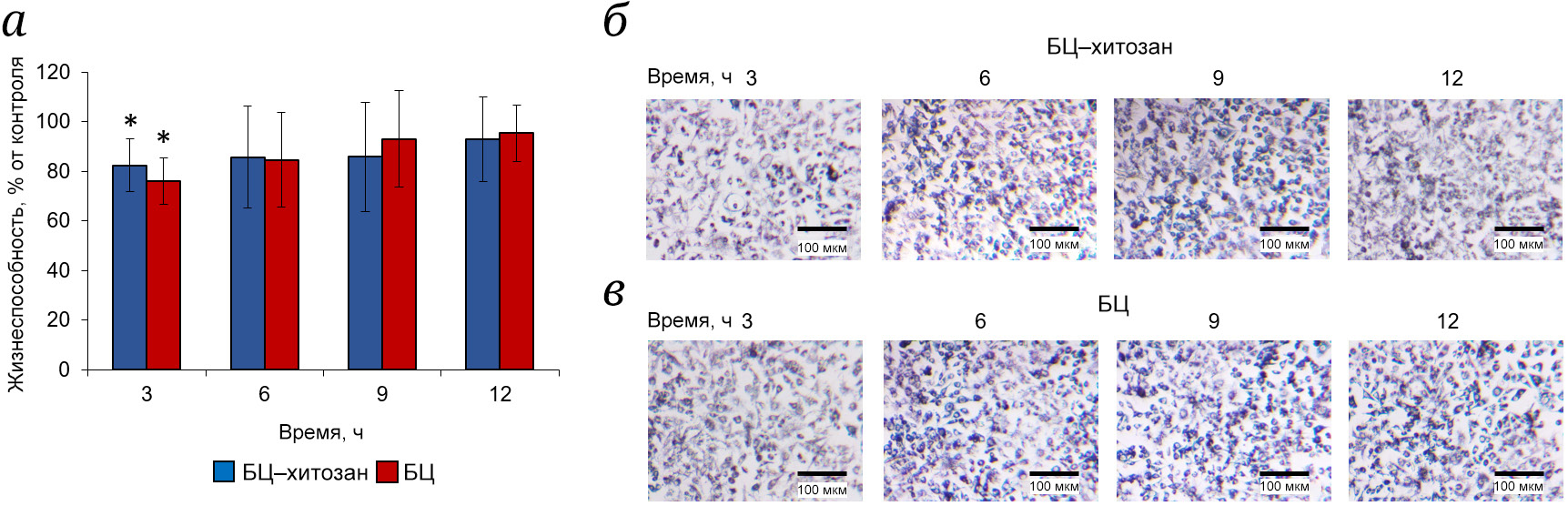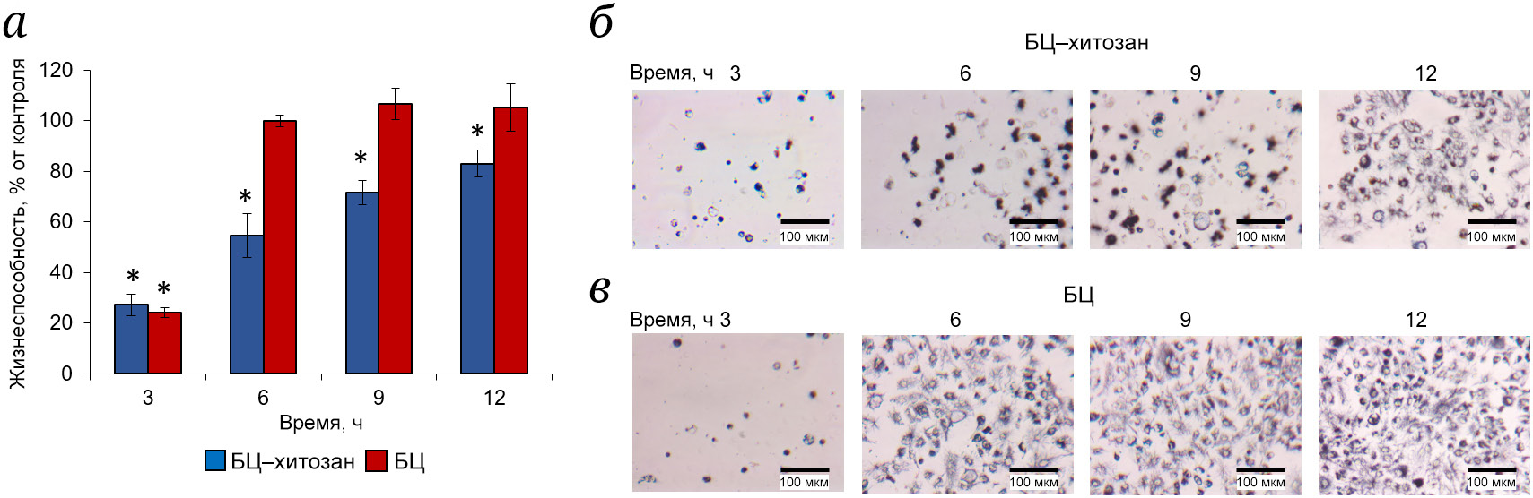Рис. 7. Продолжительность цитотоксического действия L-АСП, иммобилизованной на плёнки БЦ и БЦ–хитозан, на условно-нормальные фибробласты линии WI-38. а – Жизнеспособность клеток, измеренная методом MTT-теста, после инкубации с плёнками и последовательных переносов каждые 3 ч. Микрофотографии в режиме светлого поля клеток, синтезирующих кристаллы формазана, после инкубации с плёнками БЦ–хитозан (а) или БЦ (б) с иммобилизованной L-АСП. * p ≤ 0,05 по отношению к контрольным клеткам, инкубированным с пустыми плёнками БЦ или БЦ–хитозан