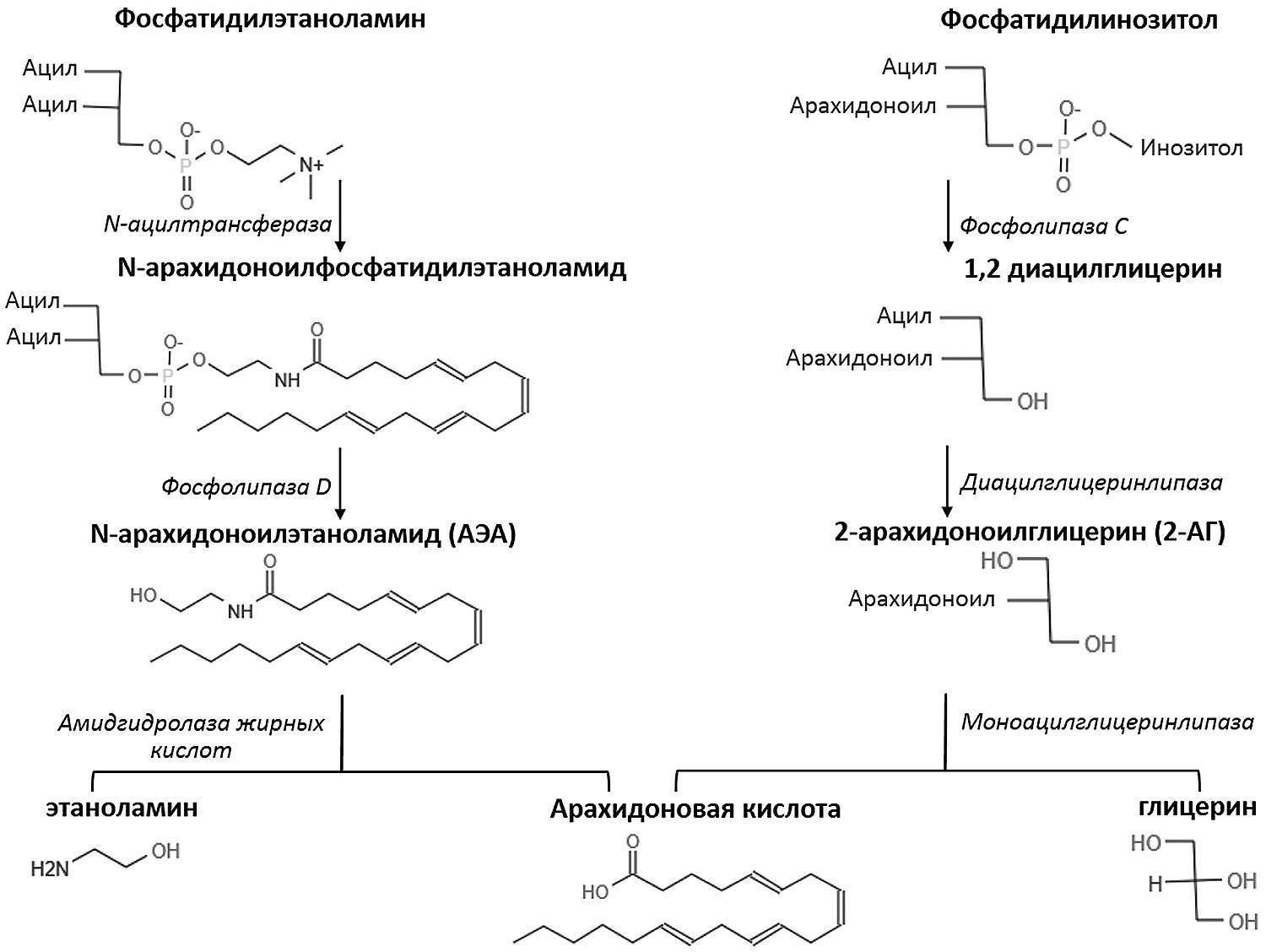 Рис. 1. Схема основных путей синтеза и деградации АЭА и 2-АГ