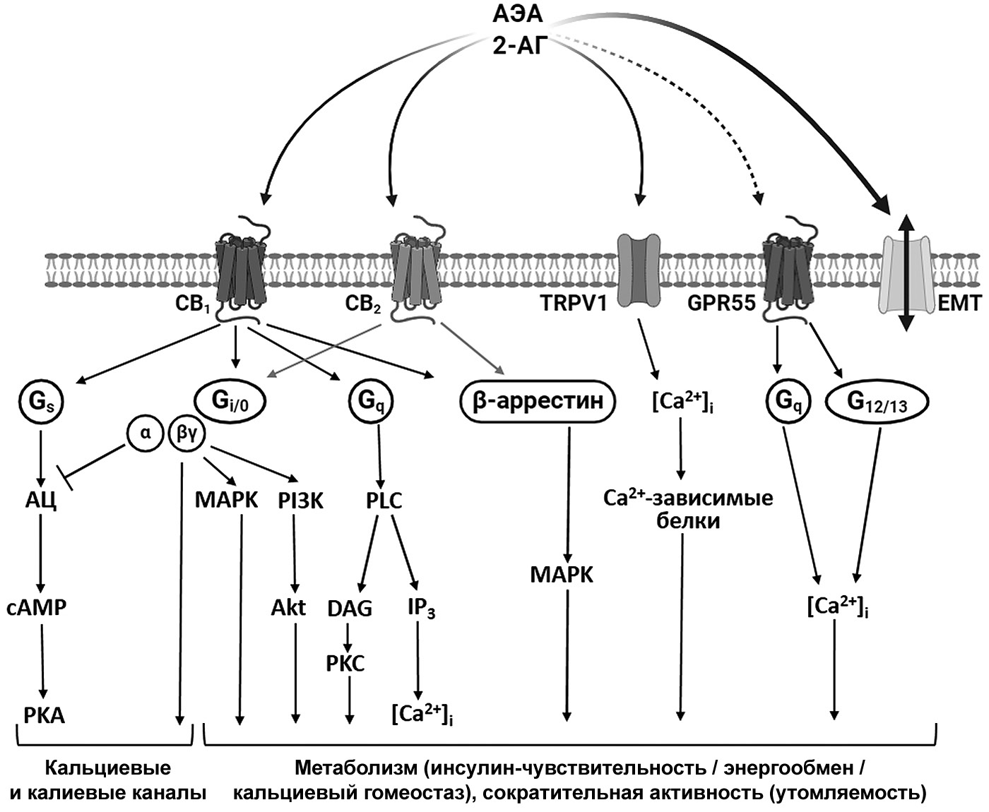 Рис. 2. Мишени действия и молекулярные каскады, запускаемые арахидонилэтаноламидом (АЭА) и 2-арахидоноилглицерином (2-АГ) в мышечных волокнах. АЦ – аденилилциклаза; cAMP – циклический аденозинмонофосфат; РКА – протеинкиназа А; РКС – протеинкиназа С; MAPK – митоген-активированная протеинкиназа; PI3K – фосфоинозитид-3-киназа; PLC – фосфолипаза С; DAG – диацилглицерин; IP3 – инозитол-1,4,5-трифосфат; [Са2+]i – концентрация внутриклеточного кальция; MEK1/2 – MAPK/ERK киназы 1/2; CB1 и CB2 – каннабиноидные рецепторы 1- и 2-типа соответственно; TRPV1 – каналы транзиторного рецепторного потенциала ванилоидного типа 1; GPR55 – орфанные рецепторы 55-типа, сопряжённые с G-белком; ЕМТ – мембранный транспортёр эндоканнабиноидов