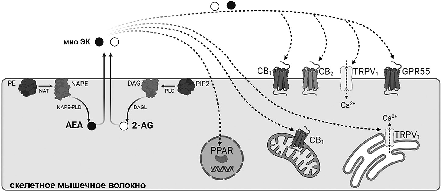 Использование иммуноблоттинга и полимеразной цепной реакции с обратной транскрипцией (ОТ ПЦР) позволило установить наличие ферментов синтеза и деградации ЭК (DAGLα и -β, NAPE-PLD, MAGL и FAAH) в скелетной мускулатуре человека и грызунов [17, 18]. При этом синтез миоЭК в мускулатуре не исчерпывается двумя классическими ЭК – АЭА и 2-АГ. Аналогичным синтезу АЭА путём образуются и структурные аналоги АЭА, из которых в мускулатуре наиболее известны такие родственные соединения, как пальмитоилэтаноламид (ПЭА) и олеоилэтаноламид (ОЭА). Они могут высвобождаться из мышц одновременно с АЭА и 2-АГ [16], хотя и в меньших количествах. Свои физиологические эффекты они проявляют, минуя СВ1- или СВ2-рецепторы, действуя преимущественно как эндогенные агонисты рецепторов, активируемых пероксисомным пролифератором (PPAR), или TRPV1-рецепторов [11, 30].