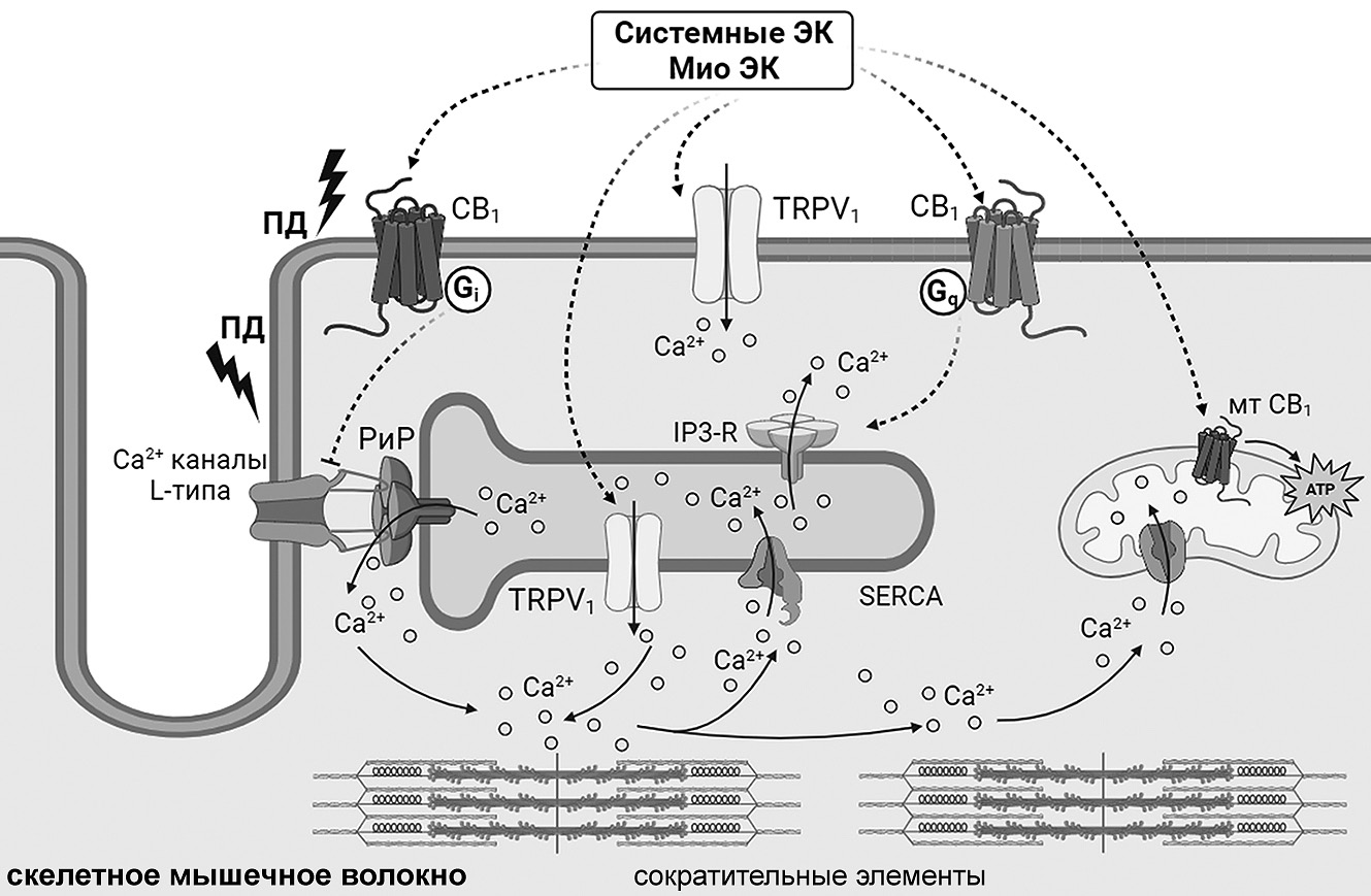 Анализ прямого действия экзогенных ЭК в миотрубках (в культуре С2С12) и изолированных зрелых мышцах (m. soleus и m. extensor digitorum longus (m. EDL)) не обнаружил изменений одиночных либо тетанических сокращений мышечных волокон, а также величин краткосрочных подъёмов уровня внутриклеточного Са2+ при его выбросе из СПР в ответ на действие IP3. Однако прямая активация СВ1-рецепторов экзогенными агонистами ускоряла развитие утомления волокон в ответ на длительную тетаническую стимуляцию, снижала общий уровень внутриклеточного Са2+ и эффективность электромеханического сопряжения (ЭМС) на фоне утомления [69]. Эти тормозные эффекты ЭК предотвращались пертуссис-токсином, нарушающим сигнализацию через Gi-белки, но сохранялиcь при блокаде рианодиновых рецепторов. Поэтому авторы предполагают, что в качестве конечной мишени, чувствительной к снижению уровня cAMP и активности РКА при активации СВ1, могут быть дигидропиридиновые рецепторы (DHPR) Т-трубочек мышечных волокон. Однако в других работах была показана возможность и не связанного с CВ-рецепторами прямого действия каннабиноидов на DHPR Т-трубочек скелетных мышц, также приводящего к ослаблению процессов ЭМС в мышечных волокнах (рис. 4) [94].
