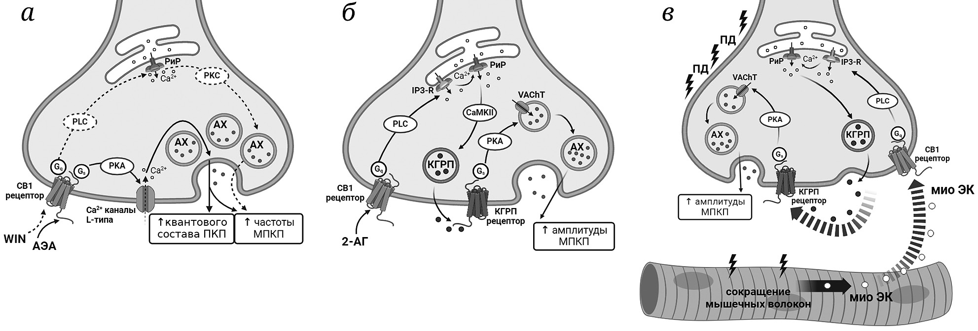 Рис. 5. Суммарная схема пресинаптических эффектов экзогенных АЭА и WIN (а), 2-АГ (б) и миогенных ЭК (в), облегчающих квантовую секрецию АХ в терминалях моторных синапсов (подробнее см. текст обзора). АХ – ацетилхолин; КГРП – кальцитонин-ген-родственный пептид; миоЭК – миогенные эндоканнабиноиды; ПД – потенциал действия; РиР – рианодиновые рецепторы; СaMKII – Са2+/кальмодулин-зависимая киназа II; CB1-рецепторы – каннабиноидные рецепторы 1-типа; IP3-R – рецепторы инозитол-3-фосфата; РКА – протеинкиназа А; РКС – протеинкиназа С; PLC – фосфолипаза С; VAChT – везикулярный транспортёр ацетилхолина