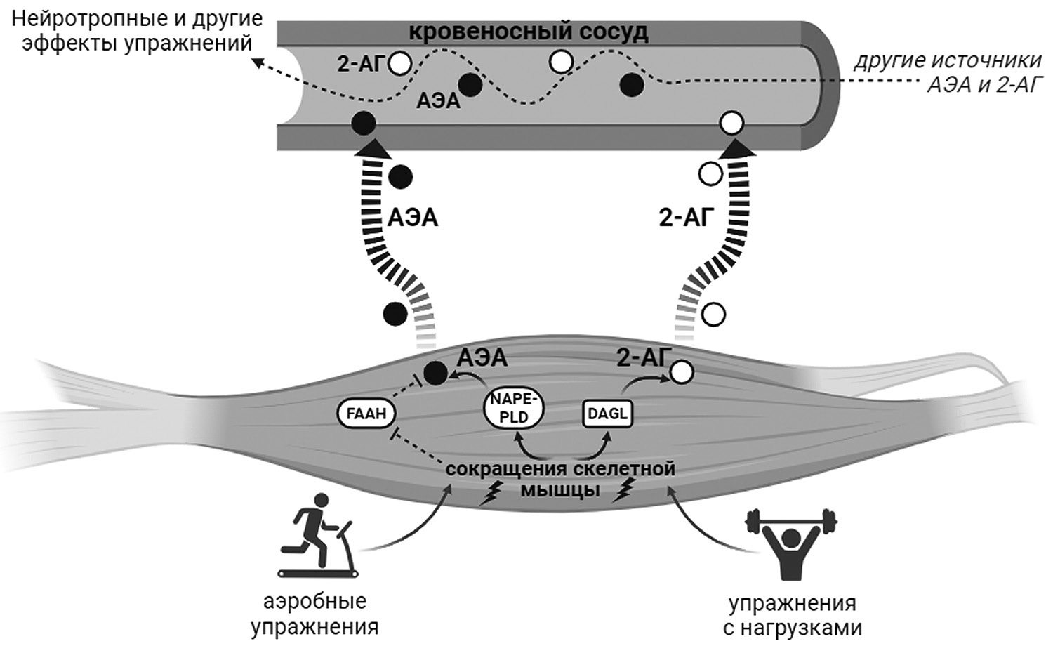 Анализ состояния ЭК-системы в кровотоке и в скелетных мышцах у разных групп испытуемых (здоровых или с патологиями) показывает, что краткосрочные аэробные упражнения (а также тренировки с нагрузкой) действительно повышают уровень ЭК [19, 121]. Из сводного метаанализа транскриптомной активности генов СВ-рецепторов, ферментов синтеза и деградации ЭК следует, что в ответ на краткосрочную аэробную нагрузку и другие виды тренировок не происходит существенного изменения уровня экспрессии генов СВ-рецепторов в мышцах подопытных участников. При этом экспрессия ферментов синтеза 2-АГ (DAGL) подавляется, а экспрессия ферментов синтеза АЭА (NAPE-PLD) – возрастает (рис. 6). В то же время в большинстве других исследований показано, что уровень экспрессии ферментов расщепления АЭА (FAAH1) в мышцах подавляется как при краткосрочных, так и при хронических (долговременных) режимах интенсивных мышечных нагрузок. В условиях хронических нагрузок обнаруживается также повышенная активность NAPE-PLD, а значит, видимо, растёт и уровень синтеза АЭА в мышце [13, 122]. Установлено, что у испытуемых уровень ЭК в плазме существенно возрастает вслед за значительной аэробной нагрузкой, но восстанавливается до первоначальных значений в течение 1 часа после упражнений [123]. Это, по мнению авторов, свидетельствует об адаптивных изменениях уровня миоЭК в ответ на физические нагрузки и возможном участии миоЭК (АЭА, 2-АГ и др.) в подъёме системного уровня ЭК во время мышечных нагрузок [19, 122]. Однако накопленные экспериментальные данные и заключения ряда обзоров о вкладе пула миоЭК в повышение системного уровня ЭК при физических нагрузках [11, 24, 26, 122] пока неоднозначно подтверждены данными других проводимых в настоящее время исследований [124]. Это связано в основном со сложностью создания единообразных условий для анализа мышечного и системного уровней ЭК при различных режимах мышечных нагрузок у индивидуумов разных групп.