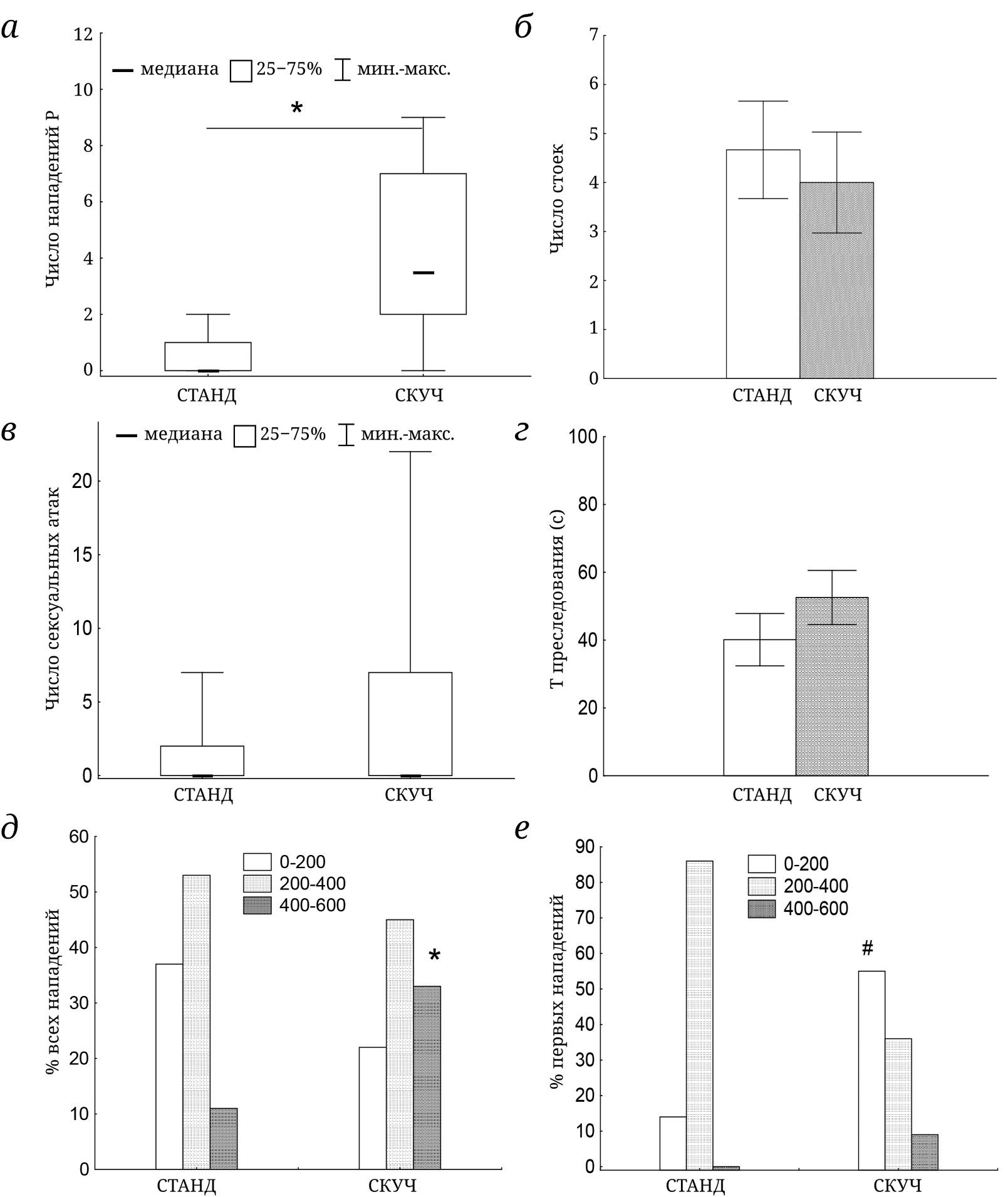 Рис. 3. Влияние содержания в условиях повышенной скученности на различные показатели поведения (а–г) и распределение нападений крыс во времени (д и е) в тесте «резидент–интрудер» (%). Т – Время; * p < 0,05 – статистически значимые различия между группами СТАНД и СКУЧ; # 0,05 ≤ p < 0,1 – тенденция (на панелях а и в – U-критерий Манна–Уитни; на панелях б и г – One-Way ANOVA; на панелях д и е – χ2, 2 × 2 таблицы)