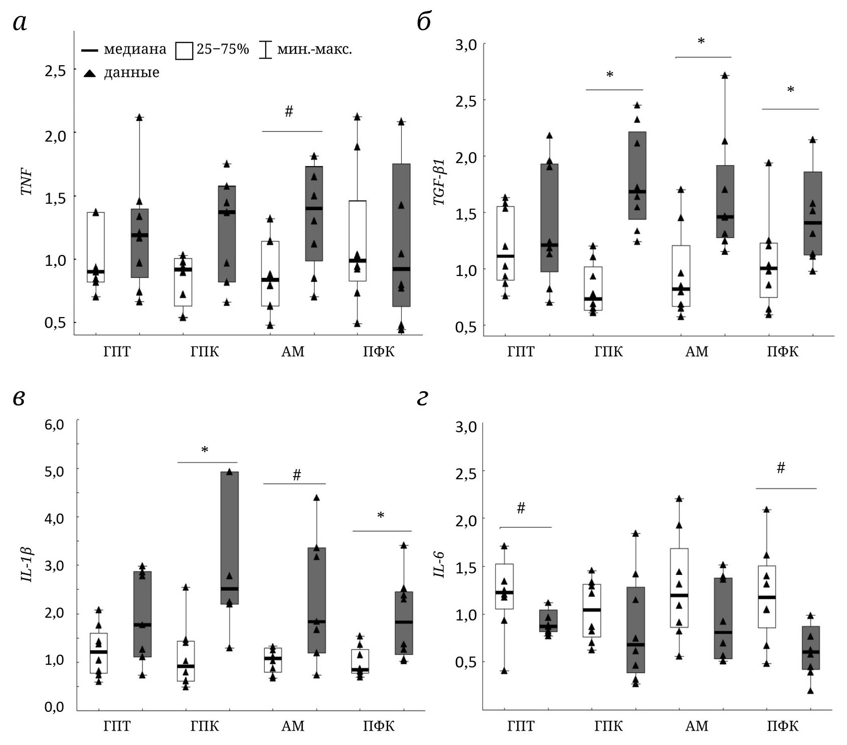 Рис. 4. Экспрессия мРНК генов провоспалительных цитокинов TNF (а), IL-1β (в), IL-6 (г) и противовоспалительного цитокина TGF-β1 (б) в различных структурах мозга у крыс группы СКУЧ и СТАНД. По горизонтали – структуры мозга (ГПТ – вентромедиальный гипоталамус; ГПК – дорзальный гиппокамп; АМ – миндалина; ПФК – дорсомедиальная префронтальная кора); по вертикали – относительное количество мРНК. * р < 0,05 – Различия между группами СТАНД и СКУЧ (U-критерий Манна–Уитни); # 0,05 ≤ р < 0,1 – тенденция