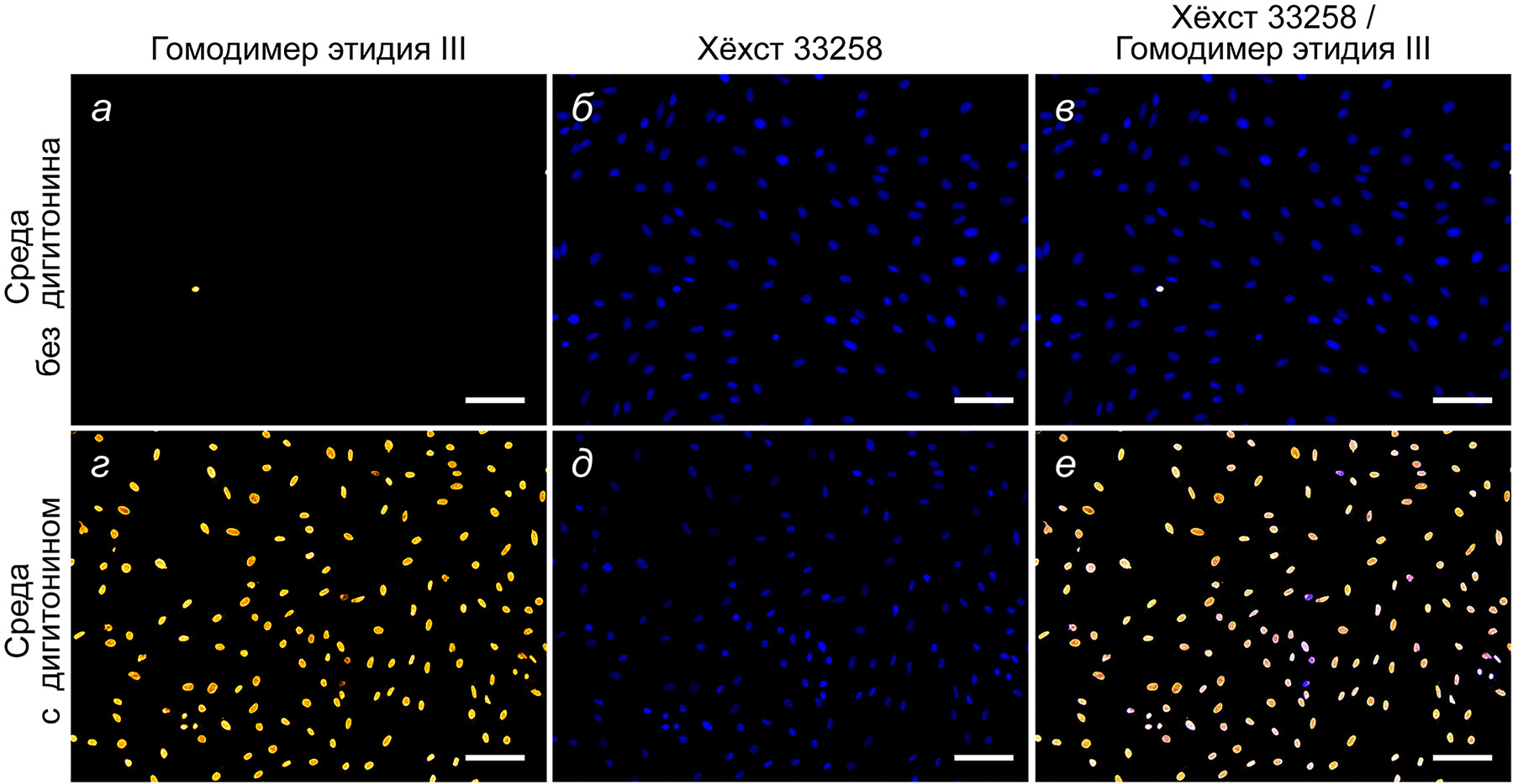 Рис. 1. Пермеабилизация клеток Н9с2 дигитонином. а–в – Гипотонический раствор без дигитонина. г–е – Гипотонический раствор с дигитонином (35 мкМ). Ядра пермеабилизованных клеток окрашены гомодимером этидия III (а, в, г, е). Длина масштабной планки соответствует 100 мкм. Объектив 10×