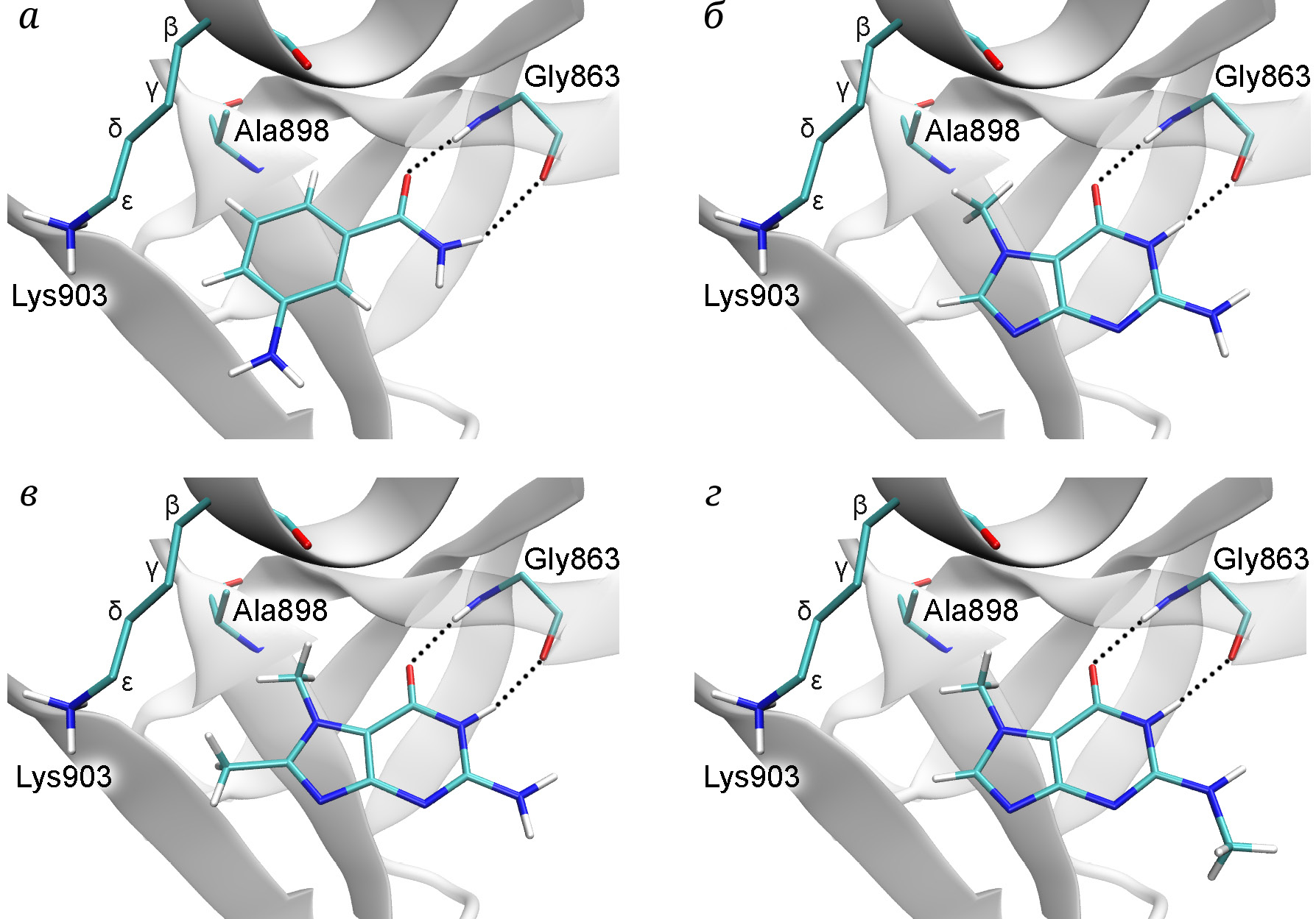 3-Аминобензамид является структурным миметиком никотинамидной группы субстрата NAD+. Как показывает молекулярное моделирование, 3-аминобензамид образует в активном центре PARP1 две водородные связи с остатком Gly863, гидрофобный контакт с боковой цепью Ala898, а также π-стэкинг c боковой цепью Tyr907 (рис. 6, а; остаток Tyr907 не показан). Данные взаимодействия характерны для субстрата, о чём можно судить по кристаллической структуре PARP1 с аналогом NAD+ бензамидадениндинуклеотидом [43]. 7-Метилгуанин (IC50 = 40,3 мкМ) также вступает в вышеперечисленные взаимодействия с моделью PARP1 (рис. 6, б), что согласуется с его конкурентным характером действия [31]. Метильная группа в положении 7 необходима для обеспечения плотного контакта с остатком Ala898. 7,8-Диметилгуанин (IC50 = 24,9 мкМ) обладает более высокой активностью по сравнению с 7-метилгуанином за счёт дополнительного гидрофобного контакта метильной группы в положении 8 с Сε-атомом боковой цепи Lys903 (рис. 6, в).