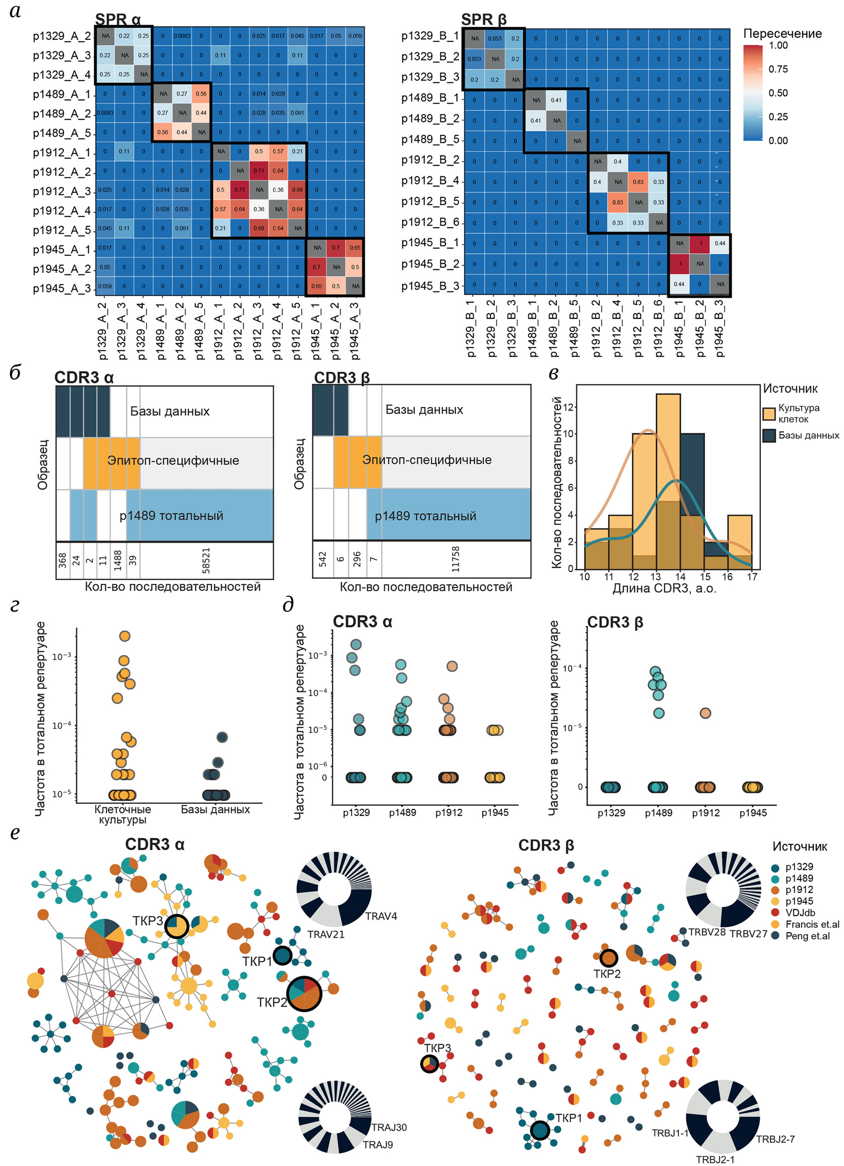 Рис. 1. Гомология SPR-специфичных репертуаров ТКР. а – Доля CDR3 α- (слева) и β-цепей (справа), пересекающихся между образцами. Рамками выделены образцы, полученные из одного донора. б – Пересечение между последовательностями CDR3 α- (слева) и β-цепей (справа), обнаруженными в публичных данных, SPR-специфичных клеточных культурах и тотальном репертуаре p1489. в – Длина CDR3 из SPR-специфичных клеточных культур p1489 (желтый) или публичных данных (синий) в тотальном репертуаре. г – Частота CDR3 из SPR-специфичных клеточных культур p1489 (желтый) или публичных данных (синий), обнаруженных в тотальном репертуаре. д – Частота SPR-специфичных клонотипов в тотальном репертуаре доноров. е – Кластеризация CDR3 α- (слева) и β-цепей (справа) ТКР. Каждая вершина представляет собой уникальную последовательность CDR3, размер круга пропорционален количеству идентичных последовательностей, линии соединяют последовательности, различающиеся на 1 аминокислотную замену. Цветом обозначены доноры, экспериментальные статьи и базы данных, из которых были взяты последовательности CDR3. Показаны кластеры, содержащие ≥ 5 (CDR3α) и ≥ 2 (CDR3β) членов. Использование V- и J-генов представлено в виде круговых диаграмм; а.о. – аминокислотный остаток