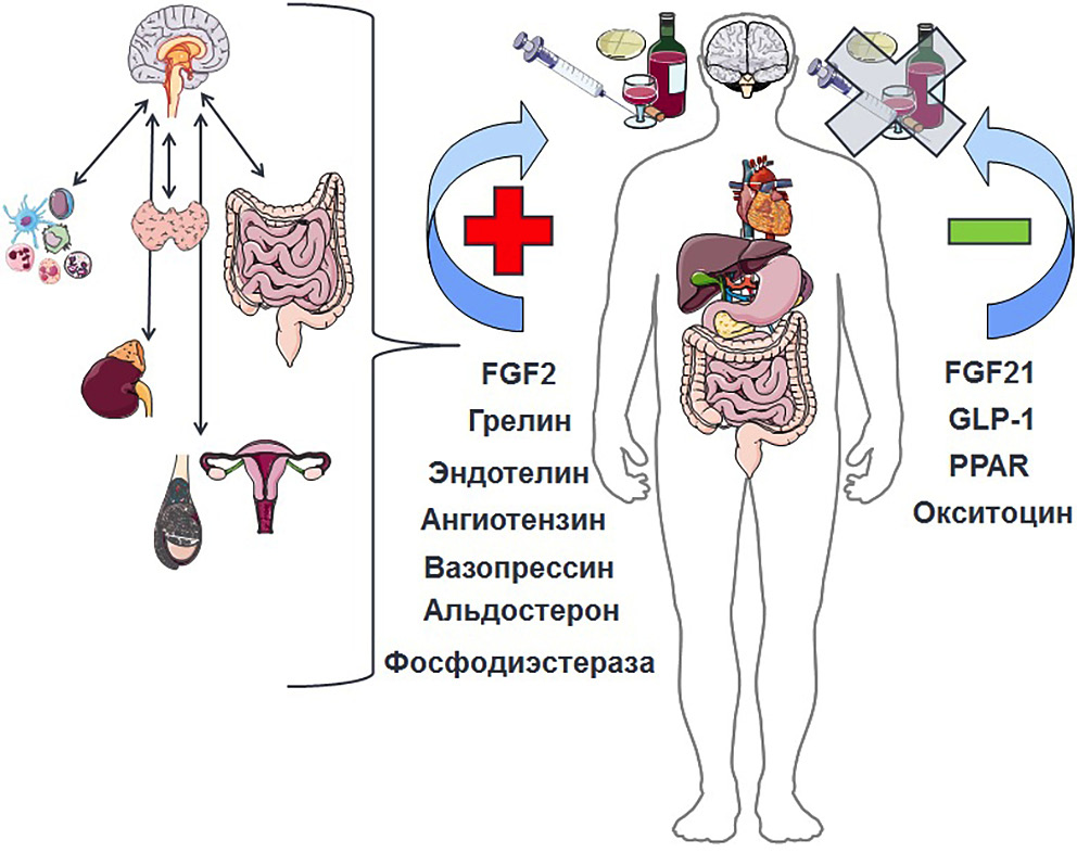 Принятые сокращения: АПФ – ангиотензин-превращающий фермент; ГГНО – гипоталамо–гипофизарная–надпочечниковая ось; ГЭБ – гематоэнцефалический барьер; ПАВ – психоактивное вещество; ССС – сердечно-сосудистая система; ЖКТ – желудочно-кишечный тракт; ANP – предсердный натрийуретический пептид; BDNF – нейротрофичесий фактор мозга; FGF – ростовой фактор фибробластов; GLP-1 – глюкагоноподобный пептид-1; PPAR – рецептор, активируемый пролифераторами пероксисом.