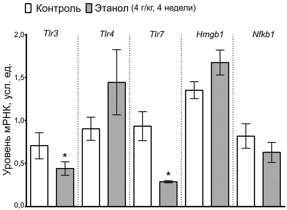 Рис. 2. Относительный уровень содержания мРНК генов системы TLR в гиппокампе мозга крыс с длительным потреблением этанола; * p ≤ 0,05 – по отношению к контрольной группе