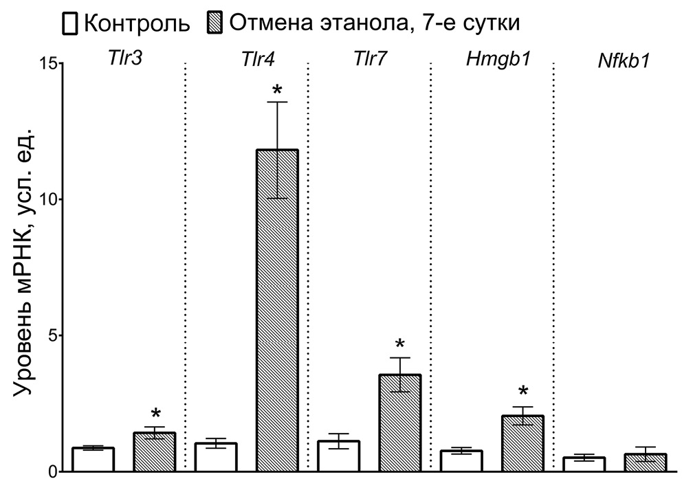 Результаты позволили получить сведения о том, что через 7 дней после отмены уровни экспрессии генов Tlr3, Tlr4, Tlr7 и Hmgb1 были повышены, уровень экспрессии гена Nfκb1 не был подвержен изменениям (рис. 3). Наиболее значимое повышение экспрессии было характерно для гена Tlr4. Полученные сведения позволяют сделать предположение о вовлеченности системы toll-подобных рецепторов в патогенетические механизмы в гиппокампе мозга, развивающиеся на фоне длительного поступления этанола в организм. Нами были получены данные, что в группе животных с длительным воздействием этанола уровни экспрессии генов Tlr3 и Tlr7 были понижены (рис. 2), тогда как в условиях отмены этанола наблюдается повышение уровня их экспрессии (рис. 3). Полученные результаты согласуются с теми данными, что были ранее получены исследователями в других структурах головного мозга, а также на аутопсийном материале от пациентов с хронической алкогольной интоксикацией [2, 13, 24]. В серии работ, целью которых служило определение функционального значения таких изменений, были получены сведения о том, что повышение экспрессии генов Tlr4 и Hmgb1 приводит к активации генов провоспалительных цитокинов и, как следствие, к развитию нейровоспаления [12, 13, 24, 33, 41]. Повышение активности генов Hmgb1 и Tlr7 ведет к активации механизмов запрограммированной клеточной гибели в нейрональных культурах (в исследованиях in vitro), т.е. к проявлению признаков нейроденерации [5]. Что касается гена Tlr3, то имеются сведения о том, что активация продукта экспрессии данного гена, эндосомального белка-рецептора TLR3, специфическими агонистами ведет к повышению уровня добровольного потребления этанола у животных [2]. Таким образом, отмеченное нами изменение в экспрессии данных генов свидетельствует о наличии стойких патологических процессов в гиппокампе мозга крыс через 7 дней после отмены этанола, и система исследуемых нами генов участвует в их реализации. Полученные данные еще раз указывают на значимость проведения исследований в этом направлении.