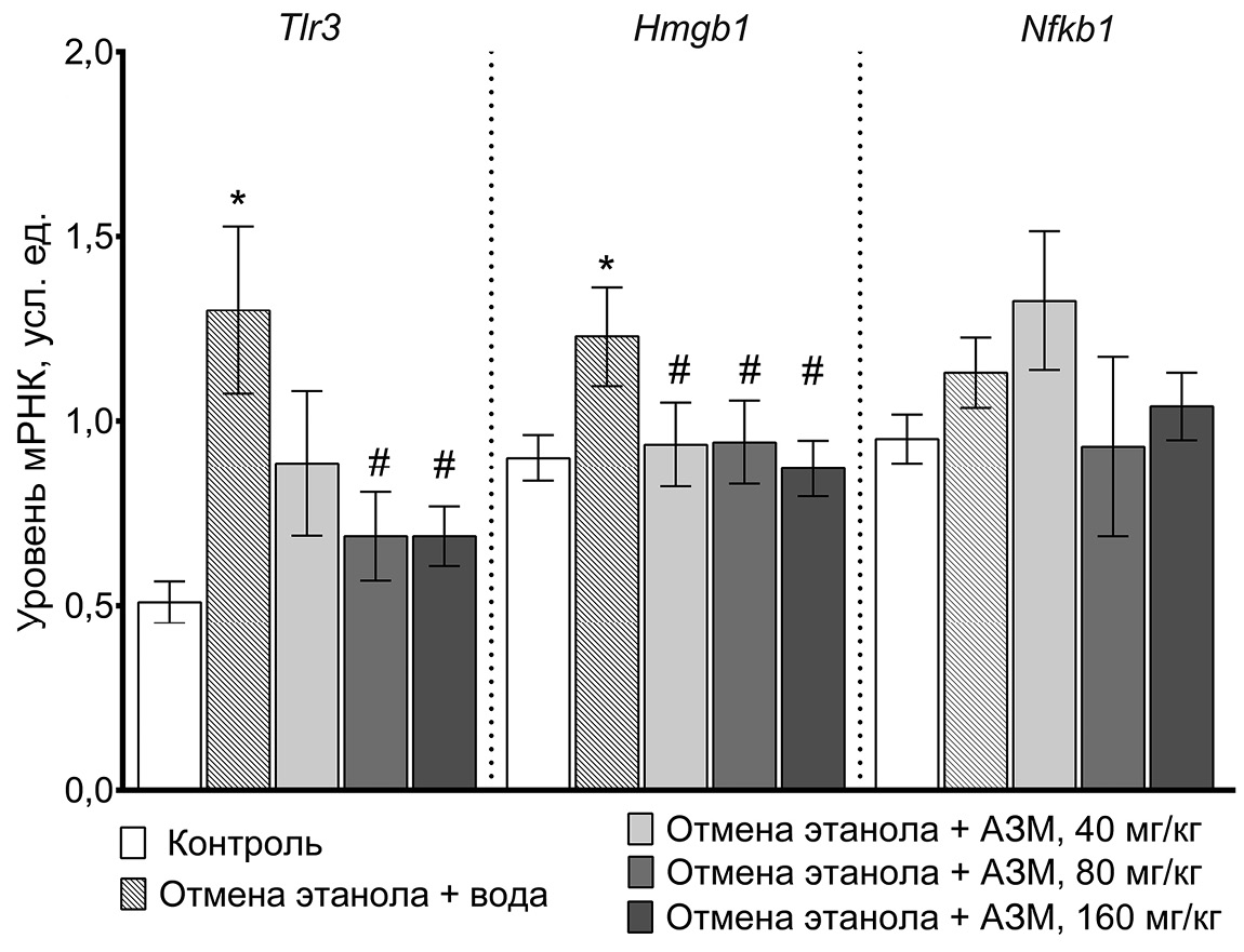 Рис. 4. Содержание мРНК генов системы TLR в гиппокампе мозга крыс при фармакологической коррекции азитромицином в условиях отмены этанола; * p < 0,05 – по отношению к контрольной группе; # p < 0,05 – по отношению к группе «отмена этанола + вода»