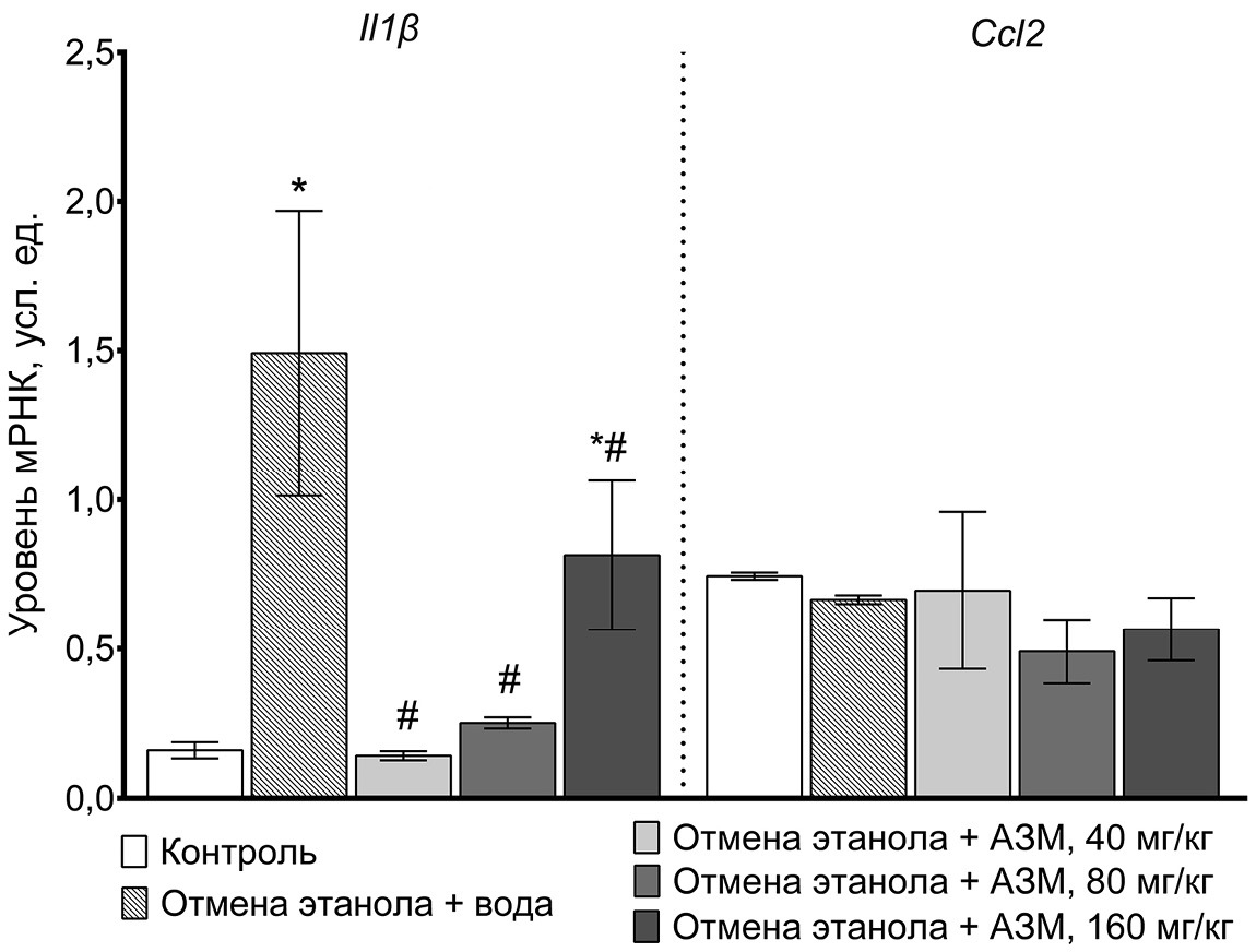 Рис. 5. Содержание мРНК цитокинов в гиппокампе мозга крыс при фармакологической коррекции азитромицином в условиях отмены этанола; * p < 0,05 – по отношению к контрольной группе; # p < 0,05 – по отношению к группе «отмена этанола + вода»