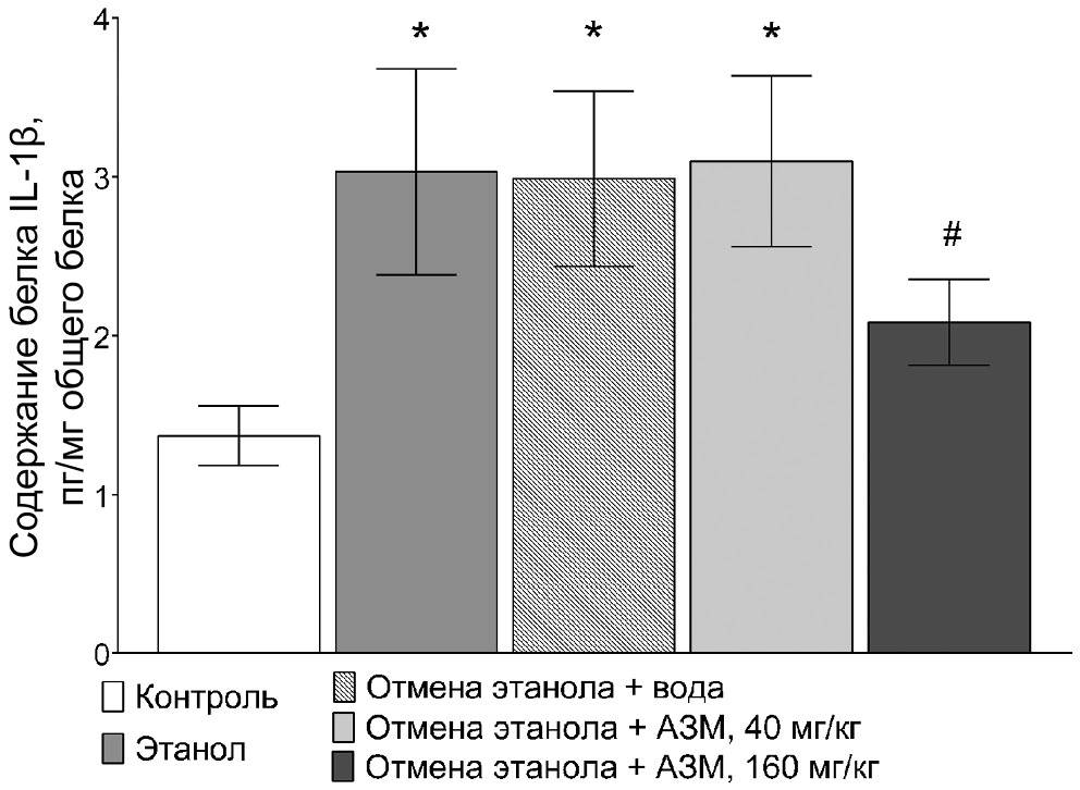 Рис. 6. Содержание белка IL-1β в гиппокампе мозга крыс; * p < 0,05 – по отношению к контрольной группе; # p < 0,05 – по отношению к группе «отмена этанола + вода»