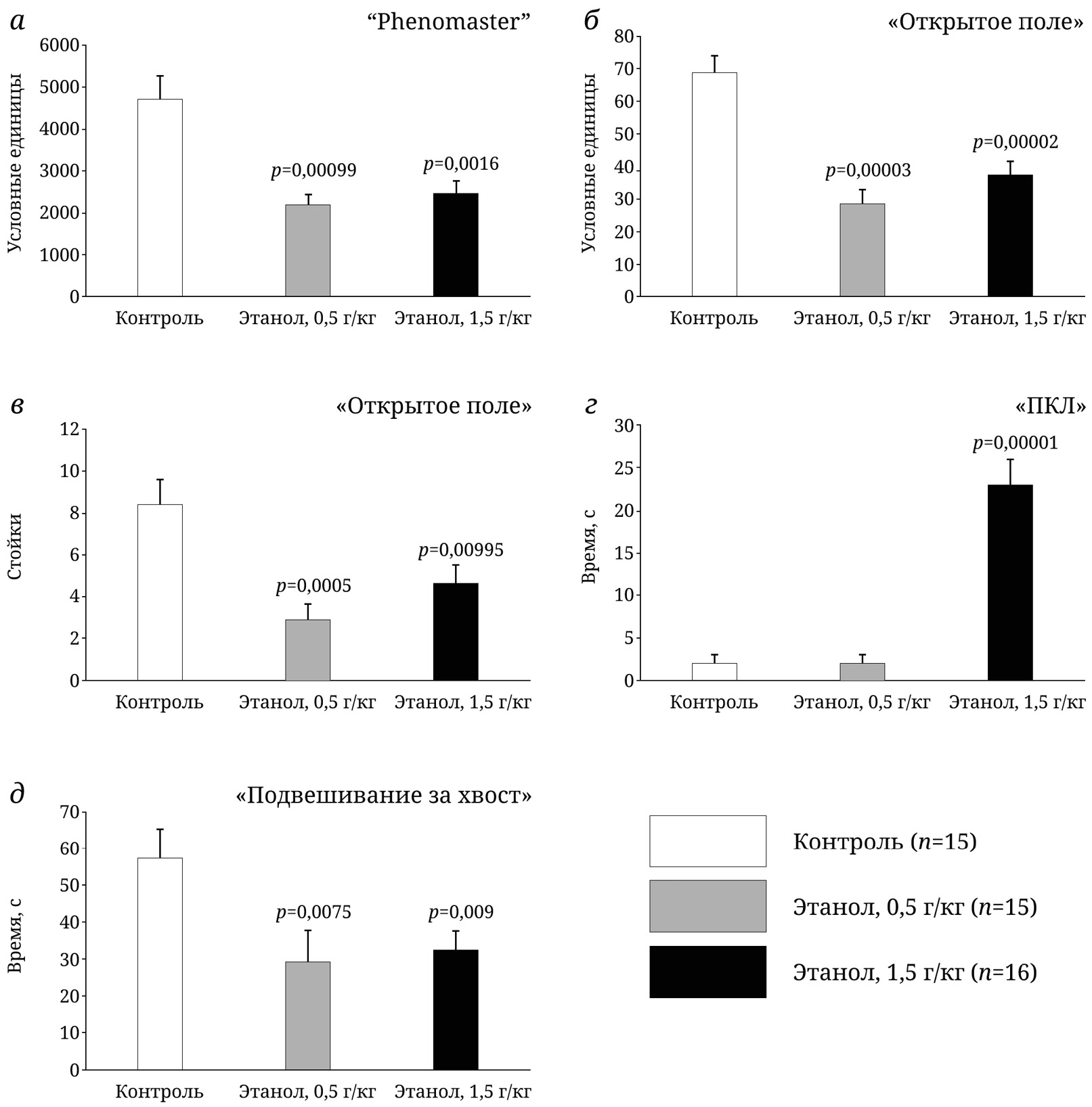 В тесте «подвешивание за хвост» у крыс, зачатых отцами, находящимися в алкогольном опьянении, наблюдалось уменьшение времени иммобилизации. Достоверное отличие от контроля, U = 49,50, р = 0,007544 в группе «Этанол 0,5 г/кг»; U = 77,50, p = 0,008991 в группе «Этанол 1,5 г/кг» (рис. 1, д).