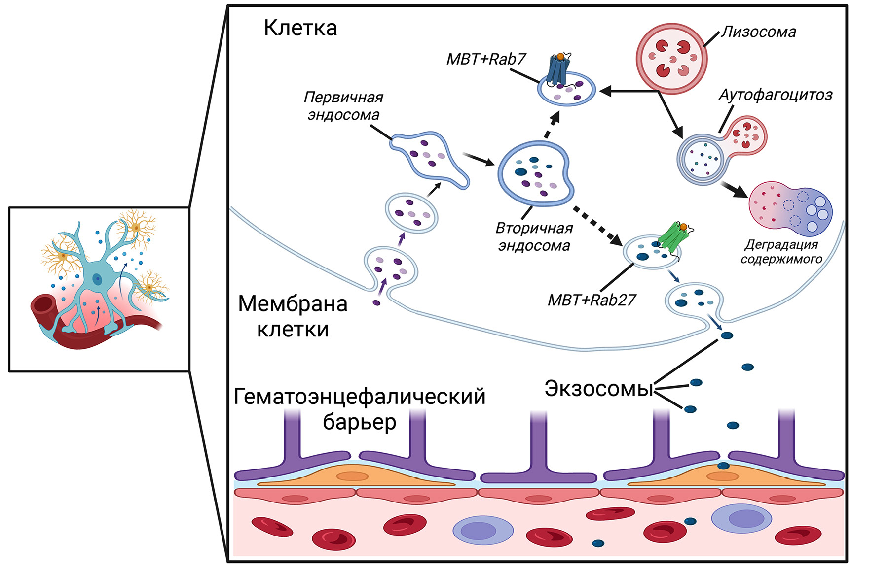 Биогенез везикул. Биогенез мВВ в настоящее время описан довольно подробно [9]. Экзосомы являются продуктом эндолизосомальной системы клетки. Первичная эндосома созревает, становясь вначале вторичной эндосомой, а затем мультивезикулярным телом (МВТ). Интралюменальные везикулы после слияния МВТ с плазматической мембраной становятся экзосомами [9]. Для МВТ существует и другой путь – слияние с лизосомами и деградация содержимого. Судьба МВТ – слияние с плазматической мембраной и секреция или слияние с лизосомами и деградация – в существенной степени зависит от представленных на мембране МВТ малых GTPаз семейства Rab. Наличие на мембране МВТ Rab27 приводит к слиянию МВТ с плазматической мембраной и секреции экзосом [10], а наличие Rab7 приводит МВТ к слиянию с лизосомой и деградации содержимого [11]. Описанные пути визуализированы на рис. 1. Впрочем, в разных ситуациях и в разных типах клеток в регуляции внутриклеточного транспорта МВТ могут принимать участие и другие представители семейства Rab [12].