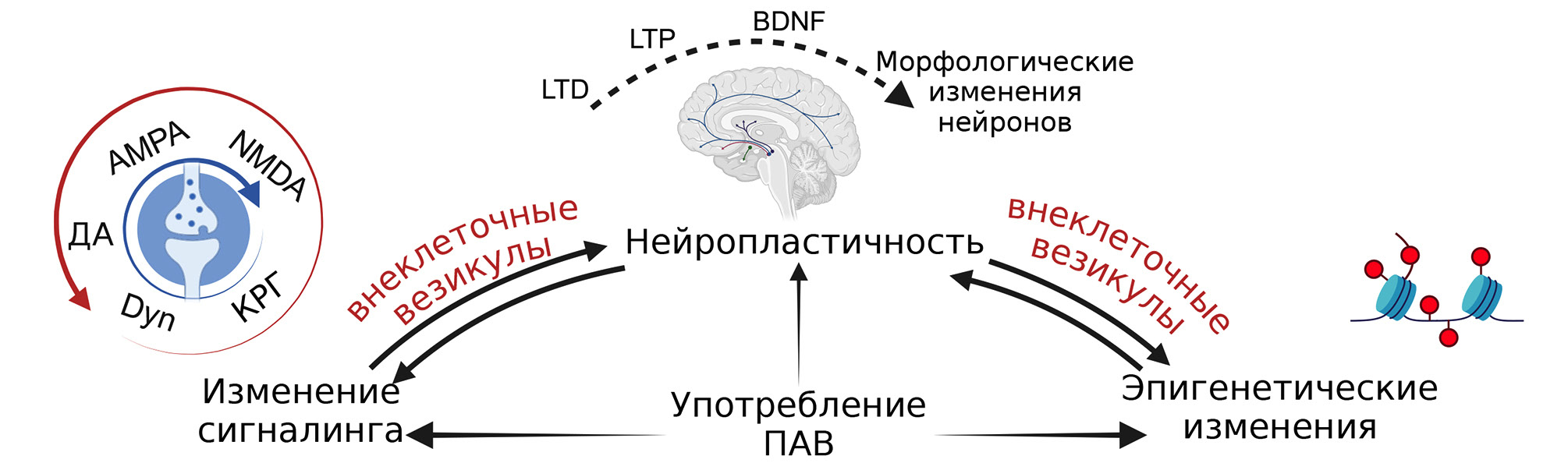 Риc. 2. Место мВВ-сигналинга в патогенезе ПАВ-индуцированных изменений. BDNF – Нейротрофический фактор мозга; LTD – долговременная депрессия; LTP – долговременная потенциация; АМPА – α-амино-3-гидрокси-5-метил-4-изоксазолпропионовая кислота; NМDA – N-метил-D-аспартат; ПАВ – психоактивное вещество; Dyn – динорфины; КРГ – кортикотропин-рилизинг-гормон; ДА – дофамин