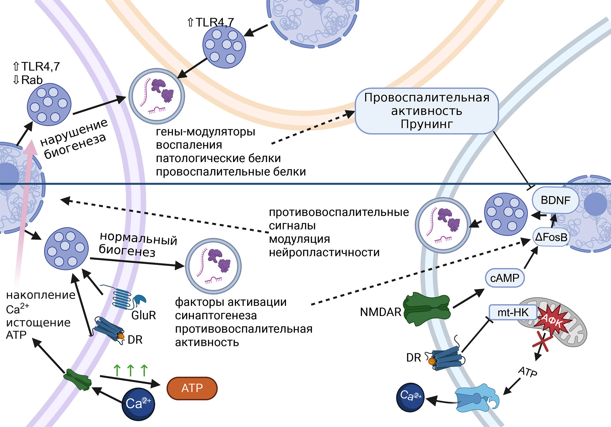 Рис. 3. Иллюстрация предложенной авторами обзора гипотезы об участии мВВ в патогенезе наркологических заболеваний. На рисунке условно обозначена система из астроцита (слева), микроглии (в верхней части) и нейрона (справа). Ниже разделительной линии представлены «быстрые изменения»: 1) при первых воздействиях ПАВ на нейрон реализуются механизмы синаптогенеза, запускающие выделение мВВ, содержащие факторы, снижающие провоспалительную активность, и «запросы» на поддержку синаптогенеза в астроците; 2) астроцит в ответ на «запрос» нейрона выделяет мВВ, содержащие противовоспалительные факторы и факторы, поддерживающие синаптогенез; 3) это обеспечивает консолидацию нейронных связей и снижение активности микроглиальных клеток; 4) параллельно ПАВ нарушают метаболизм клеток, что приводит к накоплению кальция и активных форм кислорода внутри клетки. Выше разделительной линии представлены «медленные изменения»: 1) накопление энергетических и ионных нарушений приводит к нарушению биогенеза везикул; 2) в результате повышается выработка провоспалительных факторов и патологических белков; 3) это, в свою очередь, приводит к активации микроглии, снижению синаптогенеза и нарушению нормальной нейрофизиологии. ΔFosB – дельта-FosB-белок; BDNF – нейротрофический фактор мозга; Ca2+ – ионизированный кальций; cAMP – циклический аденозинмонофосфат; GluR – рецептор к глутамату; NМDAR – N-метил-D-аспартат-рецептор; mt-HK – митохондриальная гексокиназа; АФК – активные формы кислорода