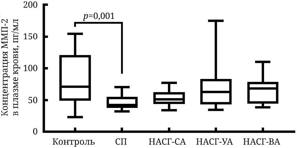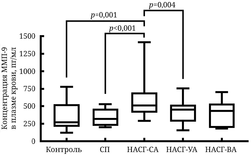 Уровень ММП-2 и ММП-9 в плазме крови при СП и НАСГ. Согласно данным дисперсионного анализа Краскела–Уоллиса, группы исследования (контрольная, СП, НАСГ-СА, -УА, -ВА) статистически значимо различаются по уровню ММП-2 (H = 15,62; p = 0,004) и ММП-9 (H = 13,38; p = 0,010) в плазме крови. Результаты сравнительного анализа уровней ММП-2 и ММП-9 в плазме крови здоровых людей, пациентов с СП, пациентов с НАСГ разной активности представлены на рис. 1 и рис. 2. Показано, что плазменный уровень ММП-2 при СП ниже, чем у здоровых людей, при этом не обнаружено различий в уровне данного показателя у пациентов с НАЖБП разных групп (СП и НАСГ разной степени гистологической активности) (рис. 1).