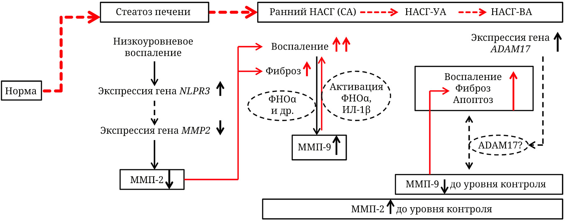 При прогрессировании НАЖБП имеет место тесная взаимосвязь процессов фиброза, воспаления и апоптоза [6, 74–76], и роль ММП в интеграции этих процессов мало изучена. Ранее мы показали, что цитокиновый профиль и уровни некоторых показателей апоптоза в крови пациентов различаются в зависимости от формы НАЖБП, и получили косвенные подтверждения связи воспаления при развитии НАСГ с процессом каспазозависимого апоптоза ЛПК [77, 78]. В свою очередь, экспрессия и активность ММП регулируются через сигнальные пути, опосредующие воспаление. Так, сигнальный путь ADAM17/TNFα/NF-κB опосредует экспрессию MMP9 в эпителиальных клетках легких [79]. ADAM17 является металлопротеиназой, осуществляющей протеолитическое высвобождение мембранной формы ФНОα, одного из основных провоспалительных цитокинов [80]. Кроме того, известно, что при НАЖБП связь воспаления и фиброза реализуется через NLRP3-инфламмосому [81]. Делеция Nlrp3, кодирующего один из основных компонентов NLRP3-инфламмасомы, у мышей с индуцируемым НАСГ и фиброзом приводит к защите от фиброза печени, снижению содержания мРНК генов Mmp2 и Col1a1 (гена коллагена I типа) по сравнению с мышами дикого типа [81]. Накапливаются сведения об участии ММП-группы желатиназ в процессах регенерации и апоптоза. Например, показано, что у Mmp9–/–-мышей ослаблена регенерация печени после частичной гепатэктомии, снижен уровень апоптоза гепатоцитов и экспрессия активной формы каспазы 3 [67].