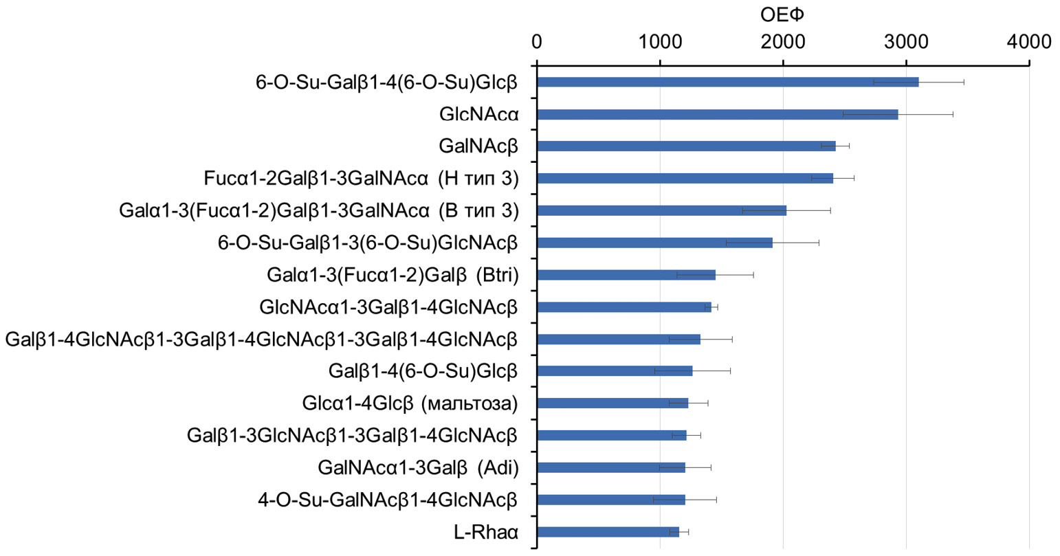 Взаимодействие стрептавидина с гликанами чипа. 1 мл раствора стрептавидина, меченного красителем Alexa 555 («Invitrogen», Карлсбад, Калифорния, США), в концентрации 1 мкг/мл (18 нМ) в фосфатно-солевом буфере (ФСБ, «Эко-Сервис», Санкт-Петербург, Россия), содержащем 0,1%-ный (v/v) Tween-20 («Sigma-Aldrich») (ФСБ-0,1%), наносили на чип (предварительно смоченный в ФСБ-0,1% в течение 10 мин при комнатной температуре) и инкубировали в течение 1 ч при 37 °C и 75%-ной влажности. Затем чип дважды промывали ФСБ, содержащим 0,05%-ный Tween-20, и, на заключительном этапе, бидистиллированной водой, после чего высушивали центрифугированием и сканировали (разрешение 10 мкм) с помощью флуоресцентного сканера InnoScan 1100 AL («Innopsys», Карбон, Франция). Изображения преобразовывали в таблицу Excel с помощью программного обеспечения ScanArray Express 4.0 с использованием метода фиксированных колец («PerkinElmer», Шелтон, Коннектикут, США) и GAL-файла. Результаты представляли в виде медианы относительных единиц флуоресценции (ОЕФ). Сигналы величины, в 10 раз превышающей ОЕФ фона (сигналы от пятен, не содержащих гликанов), считали значимыми.