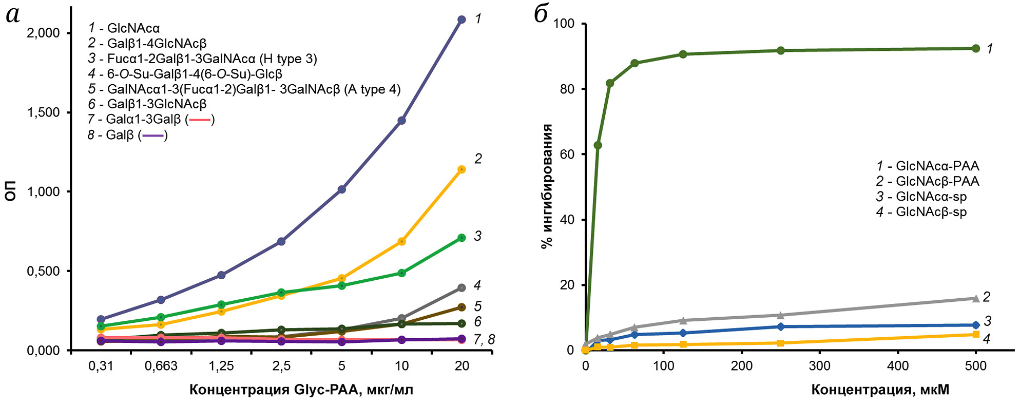 Рис. 2. Взаимодействие стрептавидина, меченного ПХ (в концентрации 0,1 мкг/мл), с конъюгатами Glyc-РАА: а – концентрационная зависимость взаимодействия с гликоконъюгатами, иммобилизованными в лунках 96-луночного планшета; б – дозозависимое ингибирование взаимодействия меченого стрептавидина с иммобилизованным GlcNAcα-РАА с помощью GlcNAcα-РАА и GlcNAcβ-РАА, а также неконъюгированными GlcNAcα-sp и GlcNAcβ-sp (sp – спейсер). ОП – оптическая плотность