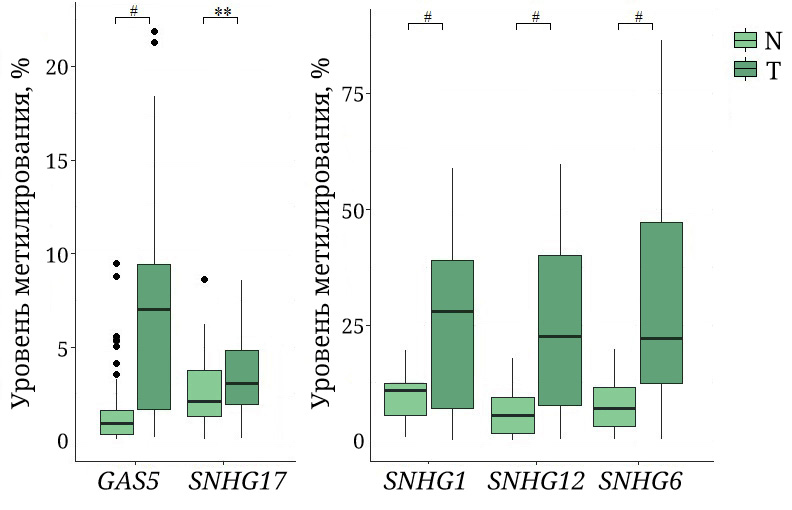 Рис. 1. Изменения уровней метилирования 5 генов днРНК семейства генов SNHG в опухолях яичников; гены GAS5 и SNHG6 исследованы в 122 образцах опухолей и 105 образцах нормы; гены SNHG1, SNHG12, SNHG17 – в 93 образцах опухолей и 75 образцах нормы; ** p < 0,01, # p < 0,0001; N – образцы парной нормальной ткани яичника; T – опухолевые образцы рака яичника