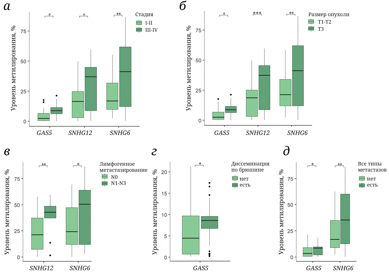 Рис. 2. Связь уровней метилирования генов GAS5, SNHG6 и SNHG12 с прогрессией РЯ; а – с клинической стадией (I–II – 45 образцов РЯ, III–IV – 77 образцов РЯ); б – с размером и распространённостью рака (T1 + T2 – 46 образцов РЯ, T3 – 76 образцов РЯ); в – с метастазированием в лимфоузлы (N0 – 101 образец РЯ, N1 – 21 образец РЯ); г – с диссеминацией по брюшине и в сальник (нет – 45, есть – 77); д – с учётом всех типов метастазирования (43 – нет, 79 – есть); * p < 0,05; ** p < 0,01; *** p < 0,001; # p < 0,0001