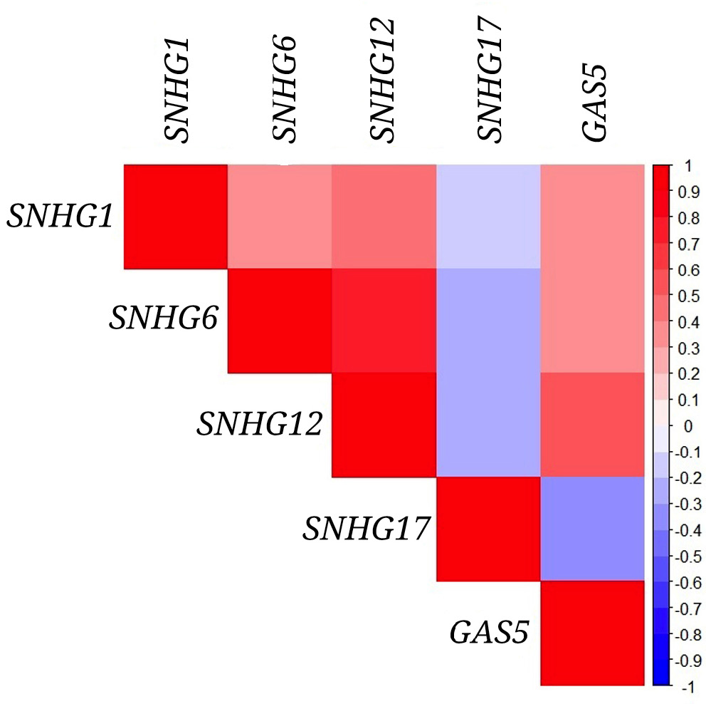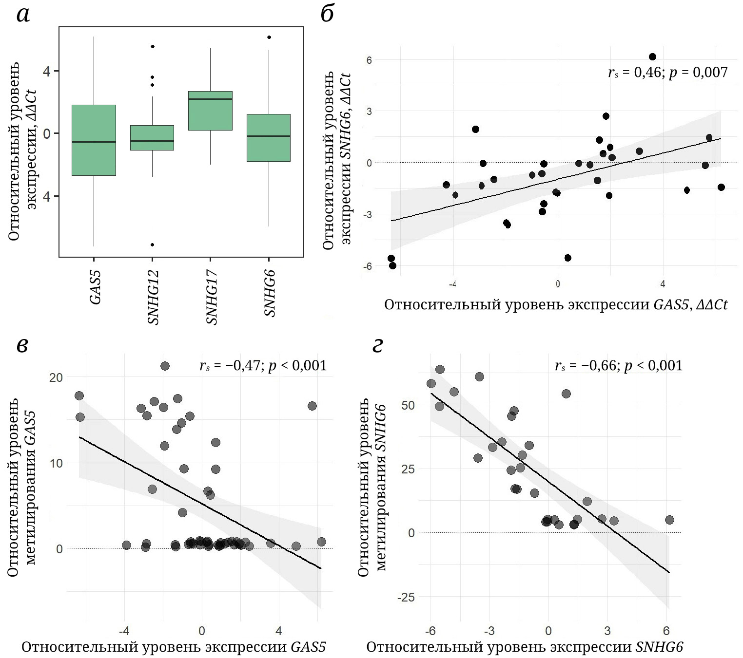 Анализ коэкспрессии генов используют для выявления генов с общими функциями и выяснения новых функций генов [11]. Кометилирование может также отражать скоординированную регуляцию генов и их совместное участие в определённых процессах. Цель данной работы – оценить в клинических образцах РЯ изменения уровня метилирования и степень кометилирования для группы генов днРНК, относящихся к семейству SNHG. Кроме того, для продолжения дальнейших исследований мы ставили себе целью предварительно оценить влияние метилирования на их экспрессию и коэкспрессию. В исследование включены 5 генов этого семейства: SNHG1, GAS5/SNHG2, SNHG6, SNHG12, SNHG17, для которых обнаружено гиперметилирование в опухолях яичников [12–14]. Из этих 5 днРНК наиболее исследован ген GAS5 (growth arrest-specific transcript 5), для которого отмечены супрессорные свойства, в том чиселе в опухолях яичников [15].