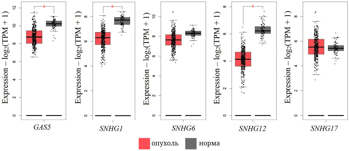 Для оценки предсказанных изменений уровня экспрессии исследуемых генов днРНК и предсказанных корреляций между этими изменениями была использована база данных GEPIA 2.0 (Gene Expression Profiling Interactive Analysis) [19], содержащая данные об экспрессии генов из библиотек TCGA для 426 образцов серозной аденокарциномы яичников и 88 образцов нормальной ткани яичников (http://gepia2.cancer-pku.cn/#index).