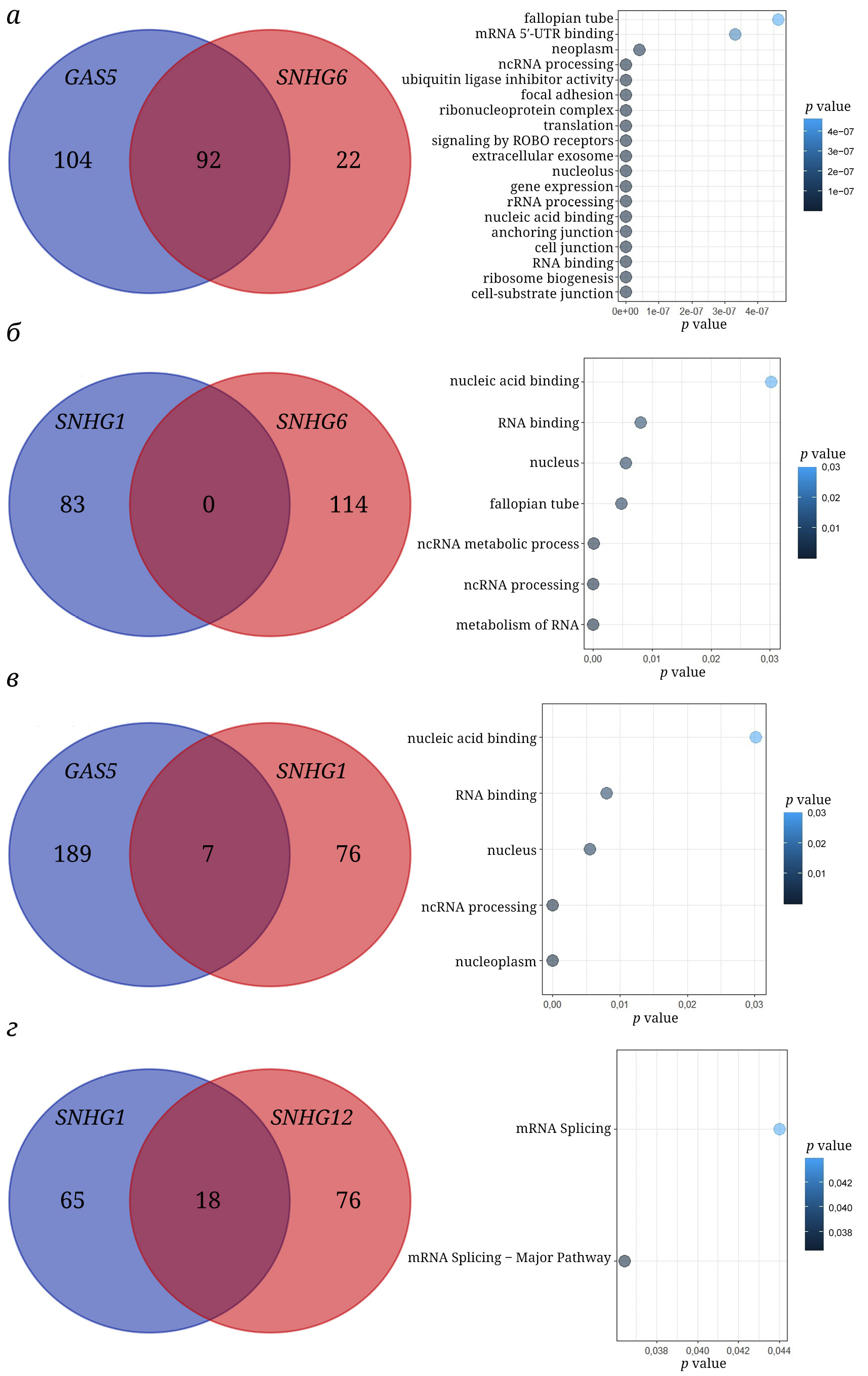 Таким образом, для группы генов днРНК семейства SNHG (SNHG1, GAS5, SNHG6, SNHG12) в опухолях яичников нами впервые обнаружена роль кометилирования и коэкспрессии, биоинформатически определены общие регуляторные миРНК и общие коэкспрессирующиеся мРНК, а также предсказано участие в общих биологических процессах, ассоциированных с онкогенезом. Среди предсказанных процессов преобладают связывание нуклеиновых кислот (рРНК, тРНК, мРНК, нкРНК, днРНК и ДНК), процессинг и альтернативный сплайсинг, биогенез рибосом и трансляция, в осуществлении которых важная роль отводится мякРНК, содержащимся в интронах генов этого семейства.