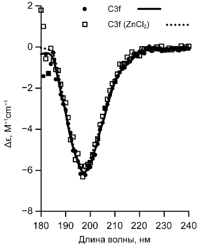 Наше предположение о способности пептида C3f связывать ионы цинка не получило экспериментального подтверждения методом спектроскопии КД: присутствие Zn2+ не оказывало заметного влияния на конформацию пептида (рис. 1). Тем не менее такой результат не опровергает возможность взаимодействия C3f с Zn2+. Пептид может изначально находиться в благоприятной для связывания Zn2+ конформации, либо индуцируемые конформационные изменения могут затрагивать только N-концевой участок, не содержащий элементов упорядоченной вторичной структуры, и не отражаться в спектре КД.