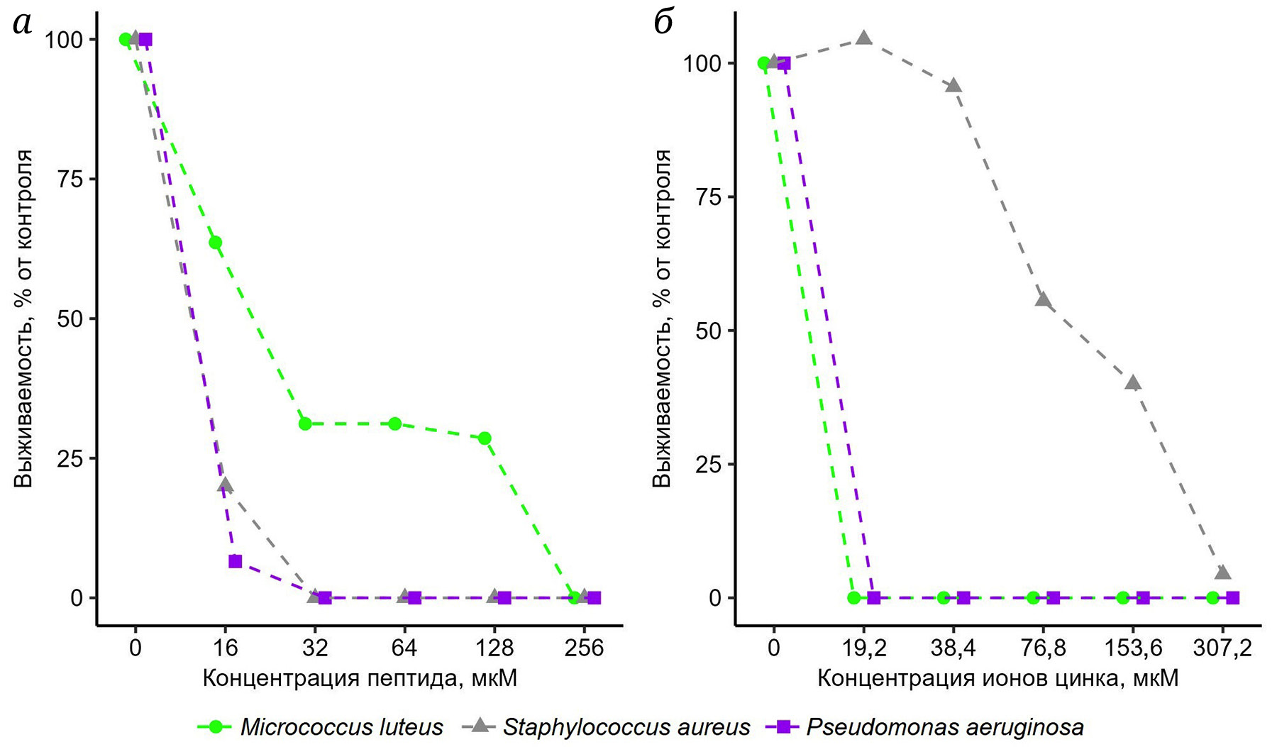 Рис. 3. Антимикробная активность пептида C3f и ионов цинка в отношении M. luteus, St. aureus и Ps. aeruginosa. а – Выживаемость бактерий в присутствии C3f; б – выживаемость бактерий в присутствии Zn2+