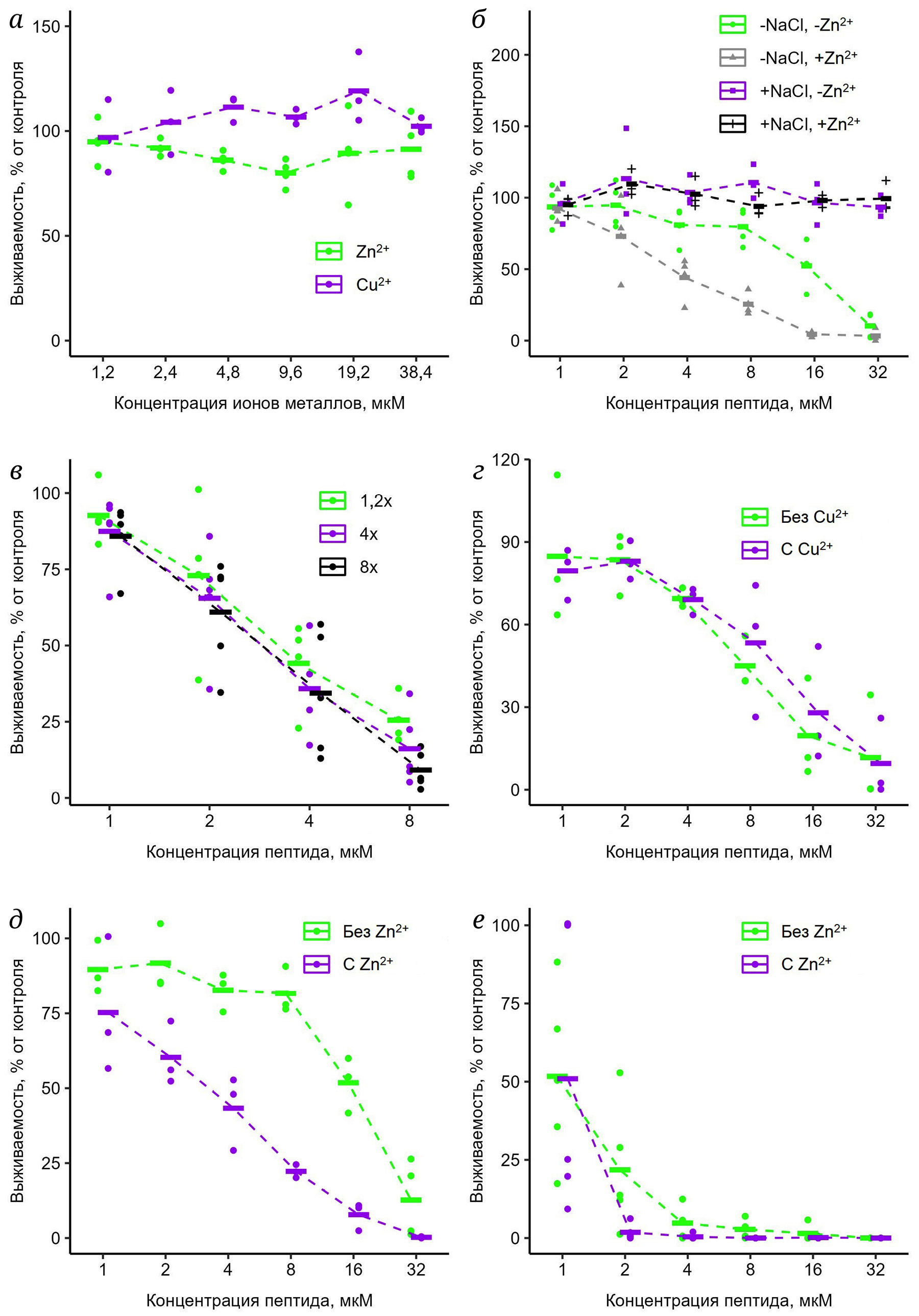 При отсутствии ионов цинка пептид C3f проявлял антимикробную активность в отношении L. monocytogenes, зависящую от концентрации, причем в присутствии 16 мкМ пептида выживаемость бактерии составляла около половины от контрольного уровня, а в присутствии 32 мкМ она была близка к нулю. Активность C3f в присутствии 20%-ного молярного избытка Zn2+ заметно усиливалась: 2-кратное снижение выживаемости достигалось уже в присутствии 4 мкМ пептида, а при 16 мкМ наблюдалась почти полная утрата жизнеспособности бактерии. Добавление в буфер 0,15 М NaCl полностью ингибировало антимикробную активность C3f независимо от присутствия Zn2+ (рис. 4, б). Увеличение концентрации Zn2+ до 4-кратного и 8-кратного молярного избытка по отношению к пептиду не приводило к усилению антимикробной активности C3f в большей степени, чем в присутствии 20%-ного избытка ионов цинка (рис. 4, в). В отличие от Zn2+, ионы Cu2+ влияния на антимикробное действие C3f не оказывали (рис. 4, г).