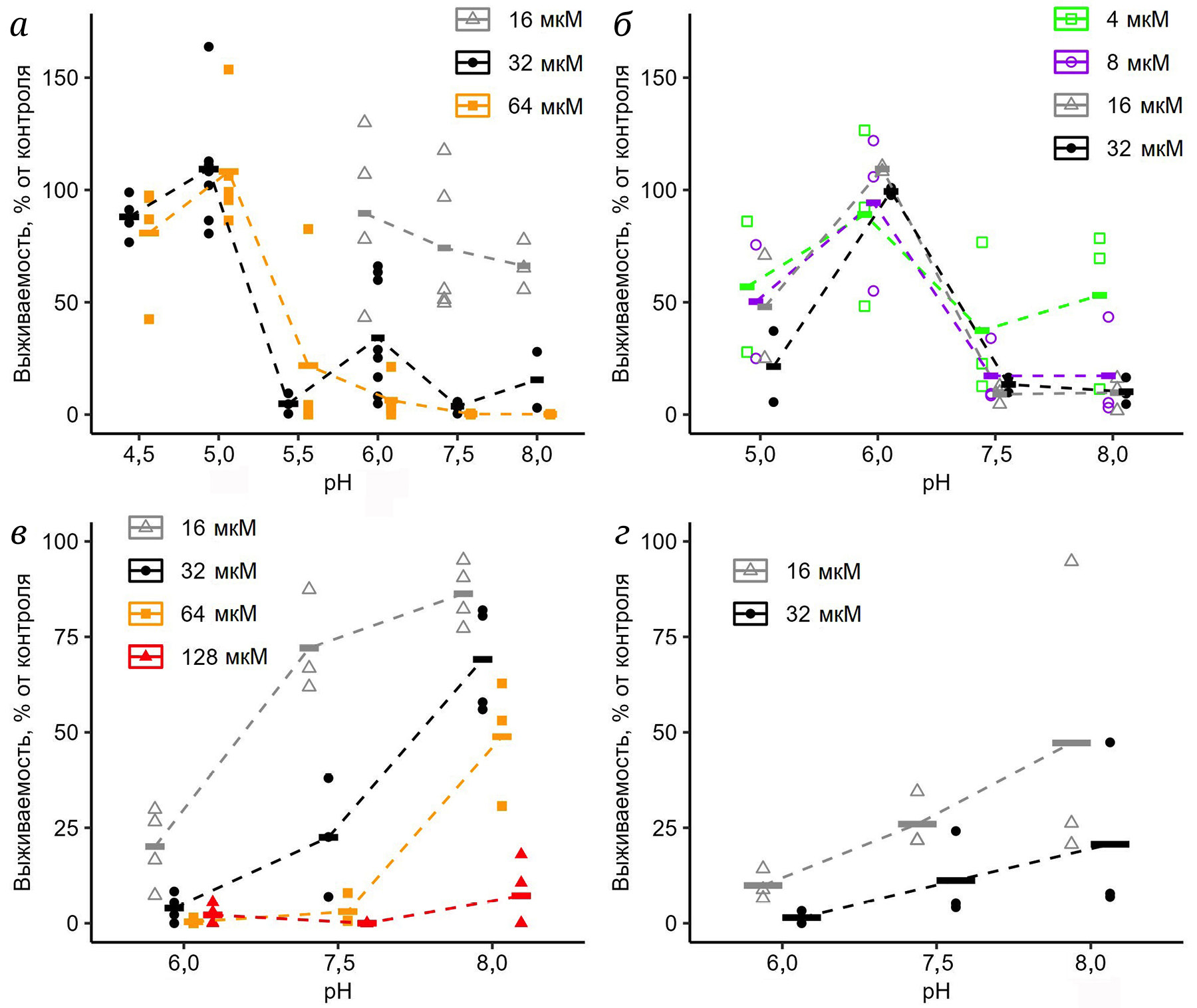 Пептид C3f[H/K] также был более активен в отношении M. luteus при более низких значениях pH (рис. 6, г). Вместе с тем зависимость его активности от pH оказалась менее выраженной по сравнению с исходным пептидом. В частности, C3f в концентрации 32 мкМ приводил к почти полному ингибированию роста бактерий при pH 6,0 и к выживаемости ~70% бактерий при pH 8,0, в то время как для 16 мкМ более активного C3f[H/K] при тех же значениях pH наблюдали 10%-ную и 50%-ную выживаемость бактерий (рис. 6, в и г).