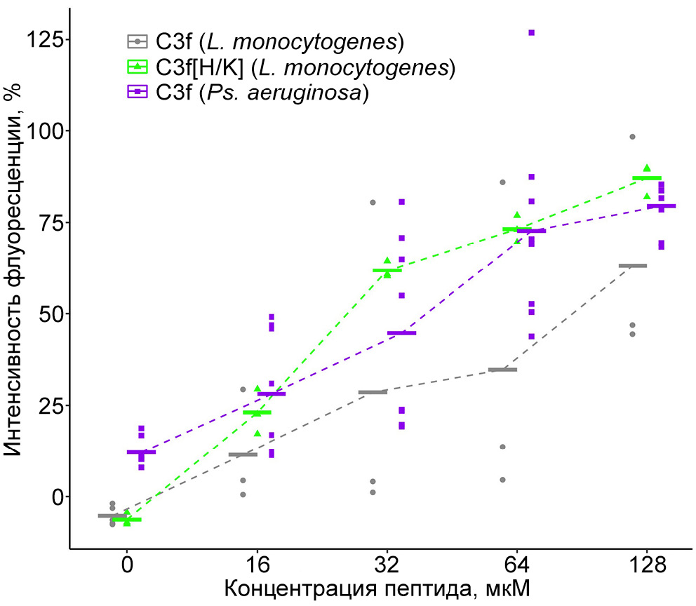 При действии C3f на L. monocytogenes и Ps. aeruginosa происходит дезинтеграция бактериальных мембран, поскольку в экспериментах с использованием йодида пропидия наблюдалось зависящее от концентрации повышение интенсивности флуоресценции в пробах, содержащих 16–128 мкМ пептида (рис. 7). Пептид C3f[H/K] приводил к более выраженному усилению флуоресценции в пробах с L. monocytogenes по сравнению с C3f. При отсутствии бактериальных клеток пептиды, взятые в максимальных концентрациях, не приводили к усилению сигнала (данные не показаны).