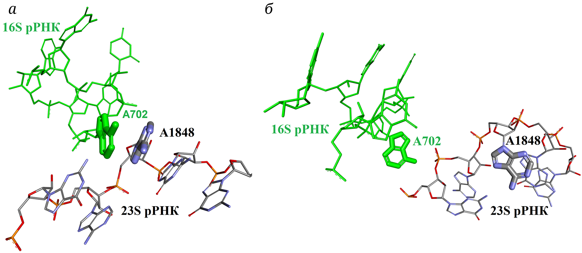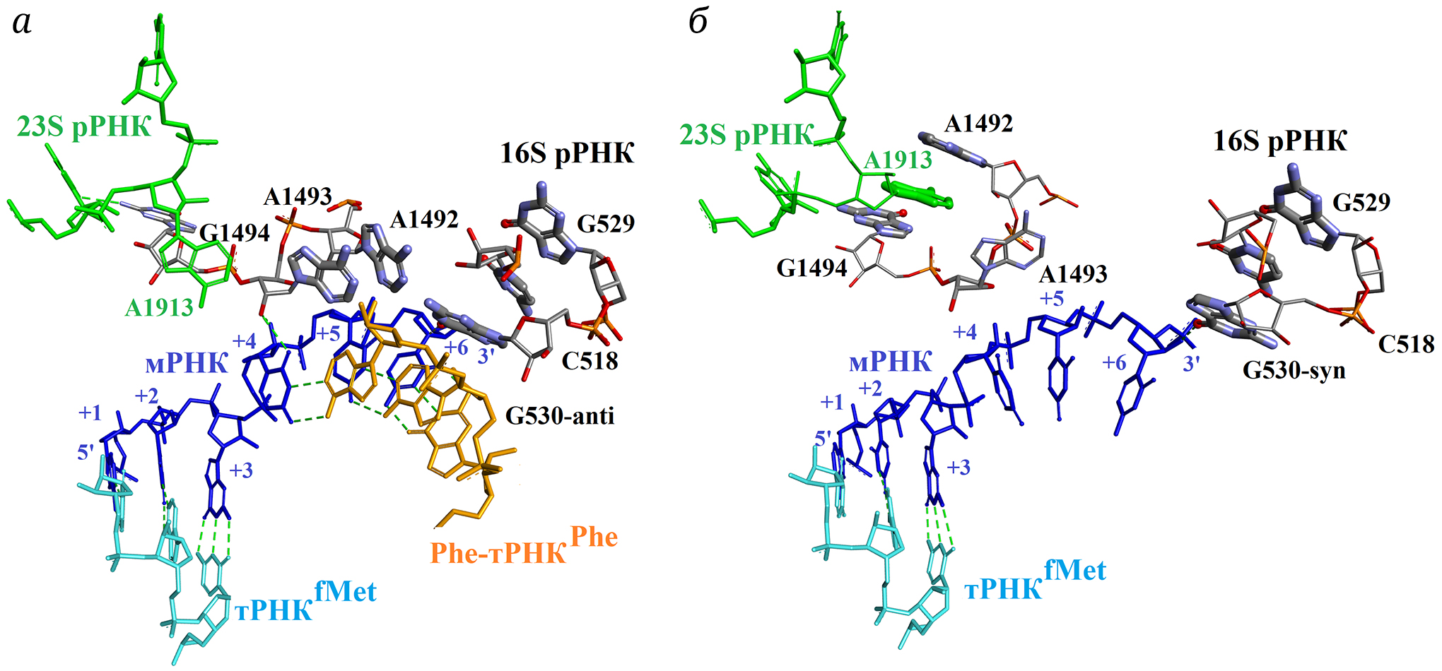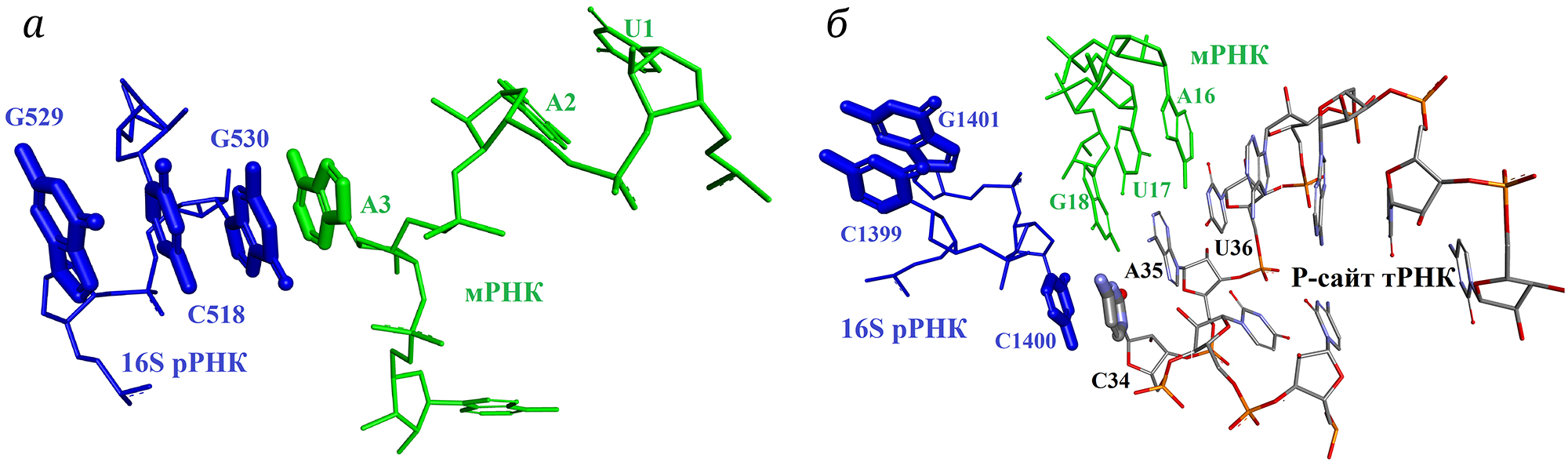 Рис. 2. Образование стопкообразного NA-BSE с участием G530 16S рРНК и А3 стоп-кодона мРНК, расположенного в А-сайте рибосомы (PDB ID: 4V67, а). Универсальный способ фиксации тРНК в Р-сайте рибосомы путём образования NA-BSE из С34 тРНК и С1400 16S рРНК, экспонированного из её полинуклеотидной цепи вследствие образования NA-BSE C1399–G1401 (PDB ID: 7K00, б)