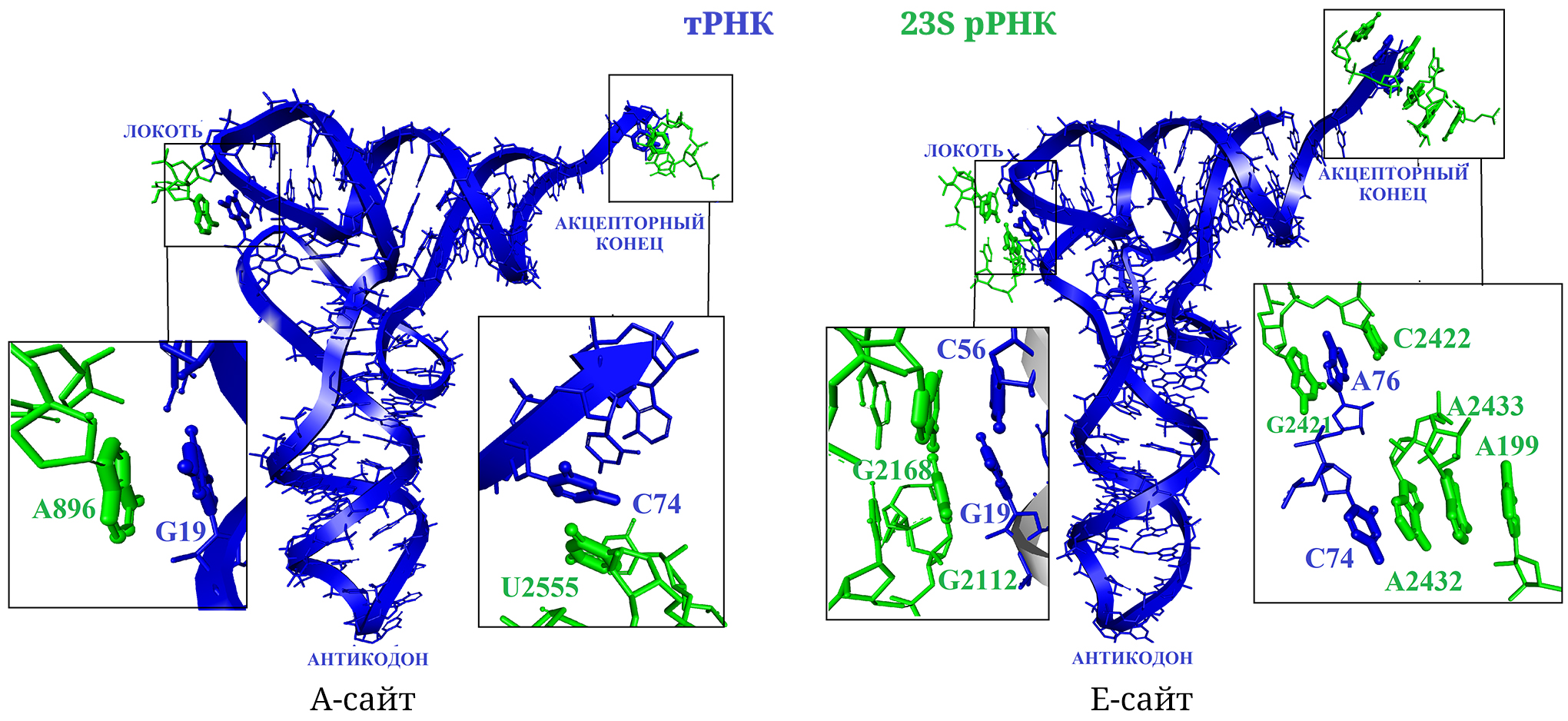 Когда тРНК находится в А-сайте рибосомы, одно из этих оснований, а именно G19, образует стэкинг-контакт с А896 рРНК большой субъединицы рибосомы [19] (рис. 4).